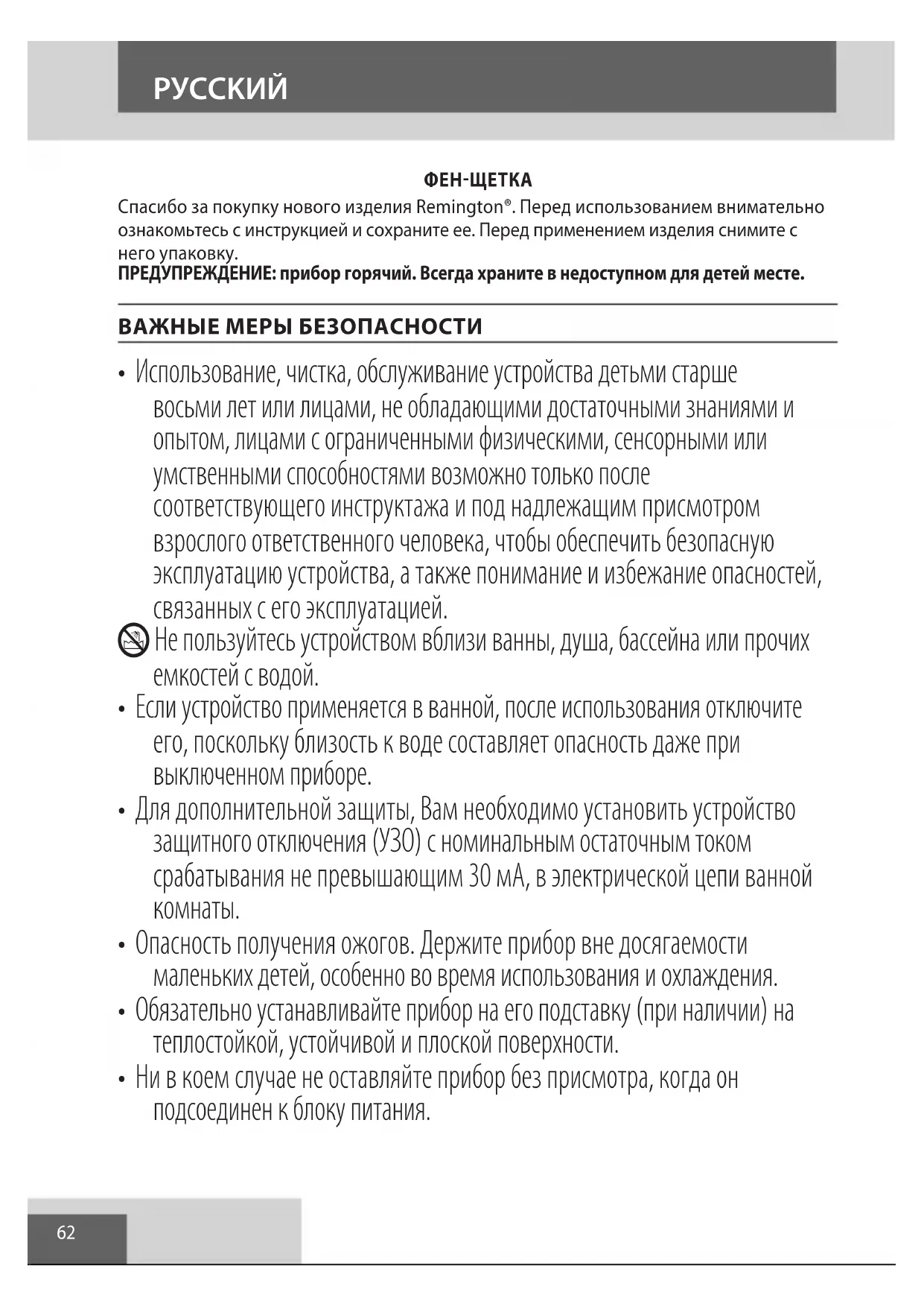 Спасибо за покупку нового изделия Remington®. Перед использованием внимательно ознакомьтесь с инструкцией и сохраните ее. Перед применением изделия снимите с него упаковку. ПРЕДУПРЕЖДЕНИЕ: прибор горячий. Всегда храните в недоступном для детей месте. ВАЖНЫЕ МЕРЫ БЕЗОПАСНОСТИ