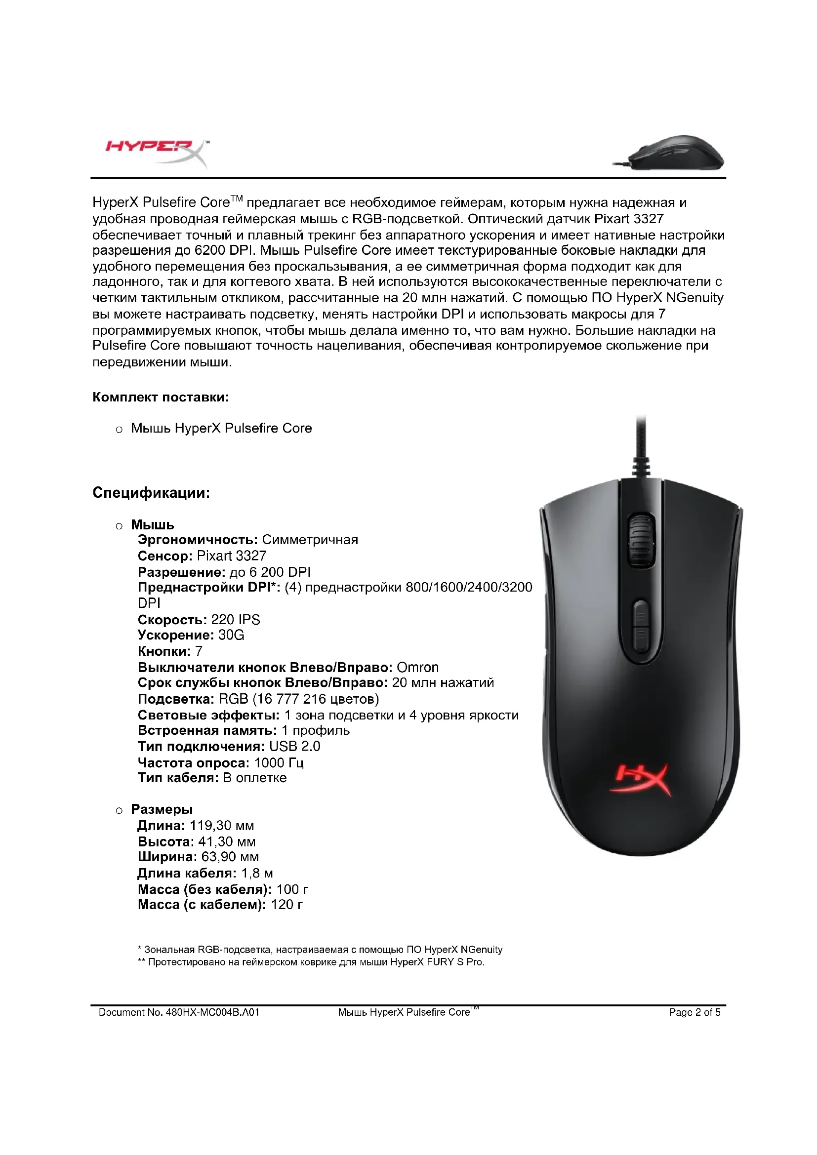 Комплект поставки: o Мышь HyperX Pulsefire Core