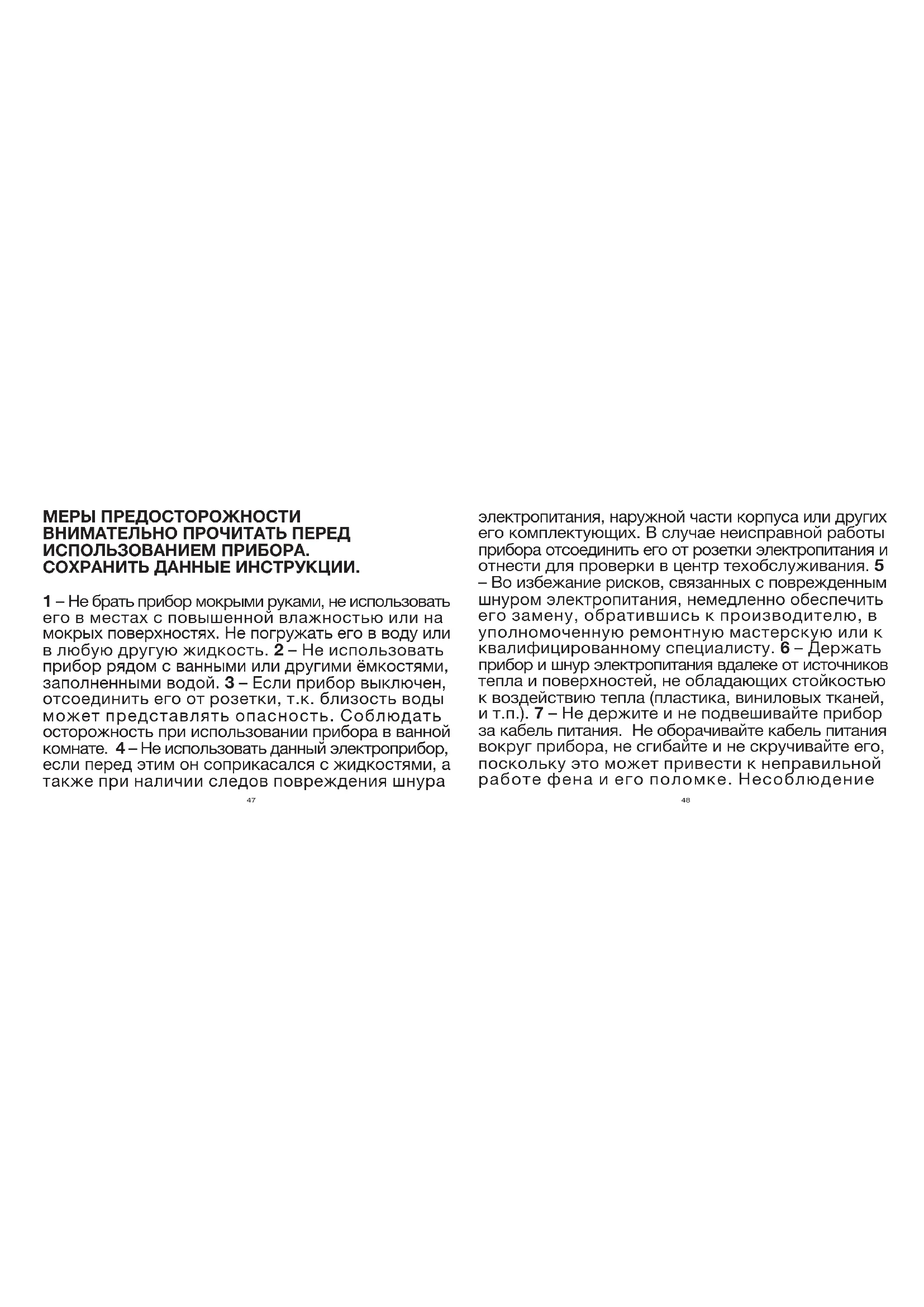 46МЕРЫ ПРЕДОСТОРОЖНОСТИ ВНИМАТЕЛЬНО ПРОЧИТАТЬ ПЕРЕД ИСПОЛЬЗОВАНИЕМ ПРИБОРА. СОХРАНИТЬ ДАННЫЕ ИНСТРУКЦИИ. 1 – Не брать прибор мокрыми руками, не использовать его в местах с повышенной влажностью или на мокрых поверхностях. Не погружать его в воду или в любую другую жидкость. 2 – Не использовать прибор рядом с ванными или другими ёмкостями, заполненными водой. 3 – Если прибор выключен, отсоединить его от розетки, т.к. близость воды может представлять опасность. Соблюдать осторожность при использовании прибора в ванной комнате. 4 – Не использовать данный электроприбор, если перед этим он соприкасался с жидкостями, а также при наличии следов повреждения шнура электропитания, наружной части корпуса или других его комплектующих. В случае неисправной работы прибора отсоединить его от розетки электропитания и отнести для проверки в центр техобслуживания. 5 – Во избежание рисков, связанных с поврежденным шнуром электропитания, немедленно обеспечить его замену, обратившись к производителю, в уполномоченную ремонтную мастерскую или к квалифицированному специалисту. 6 – Держать прибор и шнур электропитания вдалеке от источников тепла и поверхностей, не обладающих стойкостью к воздействию тепла (пластика, виниловых тканей, и т.п.). 7 – Не держите и не подвешивайте прибор за кабель питания. Не оборачивайте кабель питания вокруг прибора, не сгибайте и не скручивайте его, поскольку это может привести к неправильной работе фена и его поломке. Несоблюдение