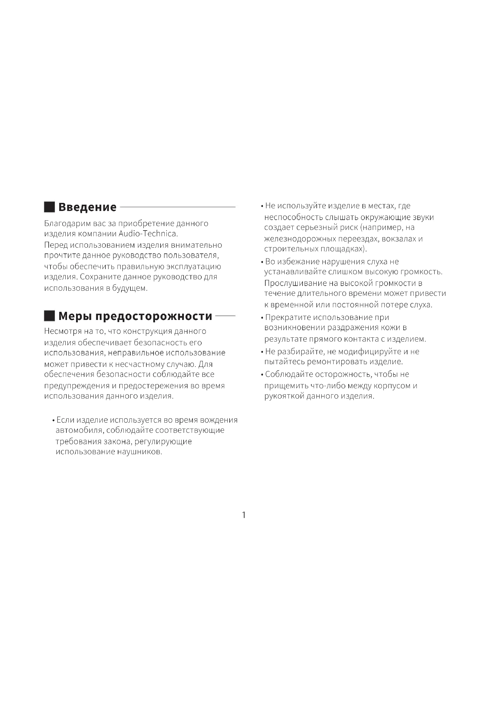 Благодарим вас за приобретение данного изделия компании Audio-Technica. Перед использованием изделия внимательно прочтите данное руководство пользователя, чтобы обеспечить правильную эксплуатацию изделия. Сохраните данное руководство для использования в будущем. Меры предосторожности Несмотря на то, что конструкция данного изделия обеспечивает безопасность его использования, неправильное использование может привести к несчастному случаю. Для обеспечения безопасности соблюдайте все предупреждения и предостережения во время использования данного изделия.