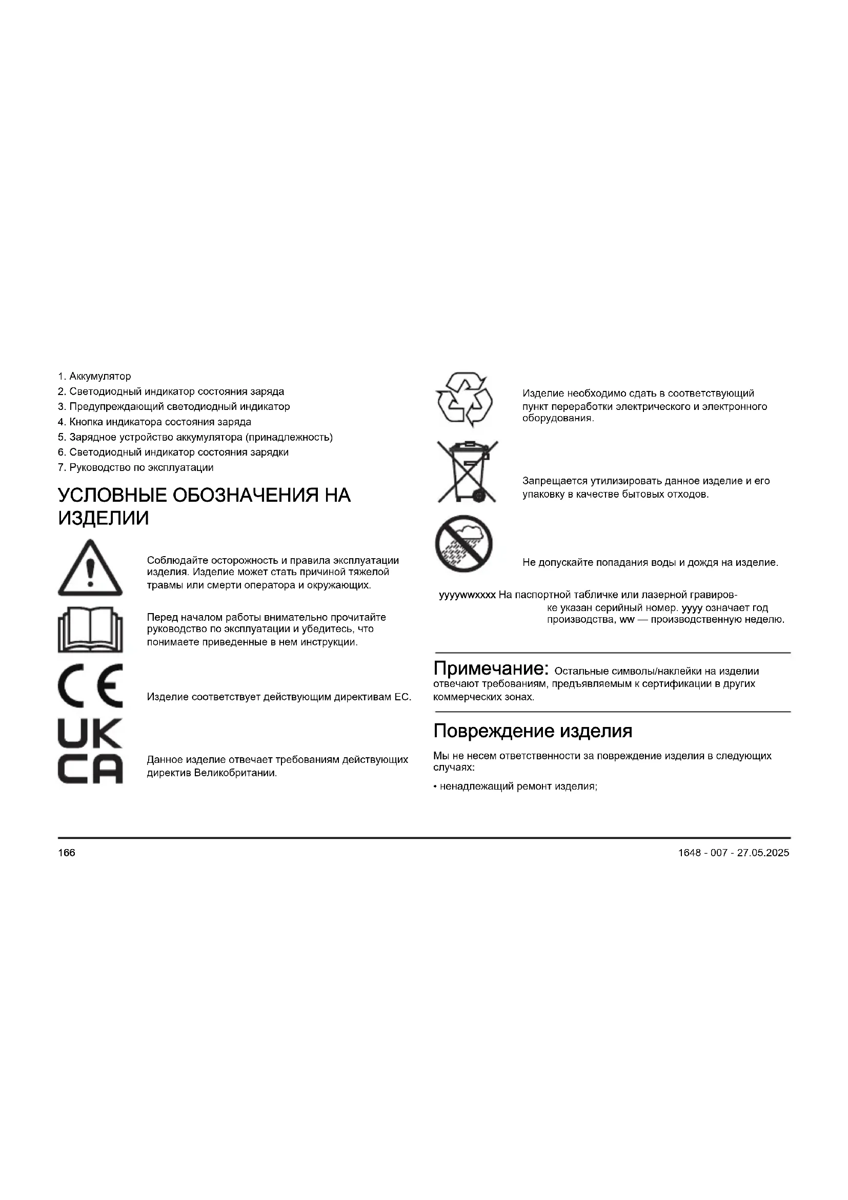 - Аккумулятор не должен подвергаться воздействию солнечного света, тепла или открытого пламени. Аккумулятор может стать причиной ожогов, в том числе химических. 1648 - 007 - 27.05.2025 167• Запрещается использовать поврежденный аккумулятор или зарядное устройство.