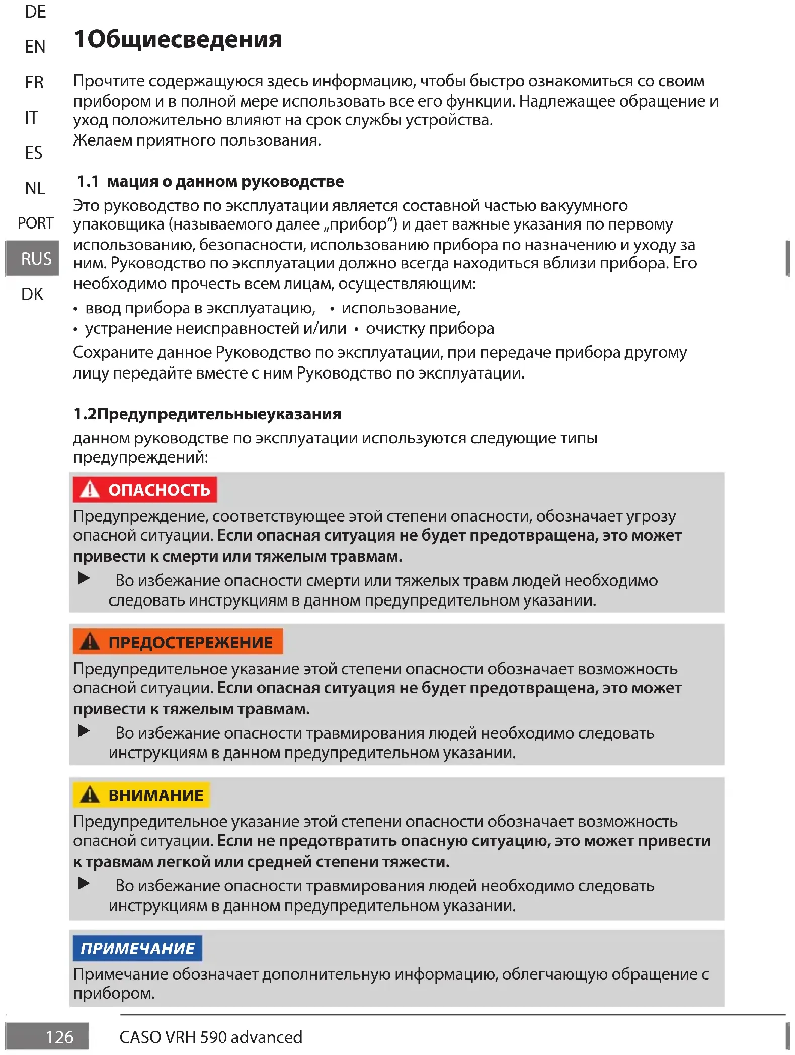 Данный прибор предназначен только для бытового использования внутри помещения для вакуумирования и запаивания пакетов и контейнеров для вакуумного упаковывания. Кроме того, это устройство может использоваться в полупрофессиональной сфере (охотники, рыболовы, повара-любители и т. д.). Любое иное использование или использование за рамками указанного считается ненадлежащим. ПРЕДОСТЕРЕЖЕНИЕ Опасность из-за ненадлежащего использования! При использовании не по назначению и/или использовании, отличном от указанного в Руководстве по использованию, прибор может являться источником опасностей.CASO VRH 590 advanced
