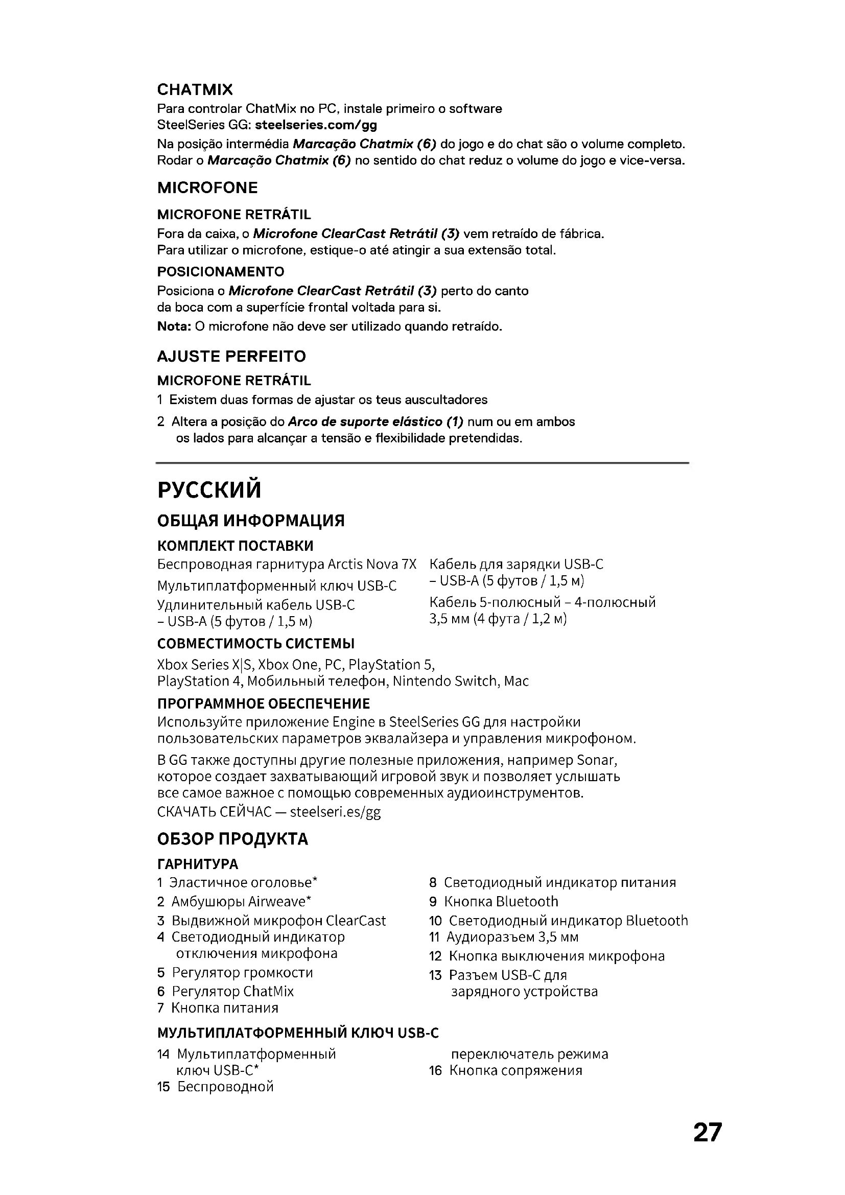 ОБЩАЯ ИНФОРМАЦИЯ КОМПЛЕКТ ПОСТАВКИ Беспроводная гарнитура Arctis Nova 7X Мультиплатформенный ключ USB-C Удлинительный кабель USB-C – USB-A (5 футов / 1,5 м) Кабель для зарядки USB-C – USB-A (5 футов / 1,5 м) Кабель 5-полюсный – 4-полюсный 3,5 мм (4 фута / 1,2 м) СОВМЕСТИМОСТЬ СИСТЕМЫ Xbox Series X|S, Xbox One, PC, PlayStation 5, PlayStation 4, Мобильный телефон, Nintendo Switch, Mac ПРОГРАММНОЕ ОБЕСПЕЧЕНИЕ Используйте приложение Engine в SteelSeries GG для настройки пользовательских параметров эквалайзера и управления микрофоном. В GG также доступны другие полезные приложения, например Sonar, которое создает захватывающий игровой звук и позволяет услышать все самое важное с помощью современных аудиоинструментов. СКАЧАТЬ СЕЙЧАС — steelseri.es/gg ОБЗОР ПРОДУКТА