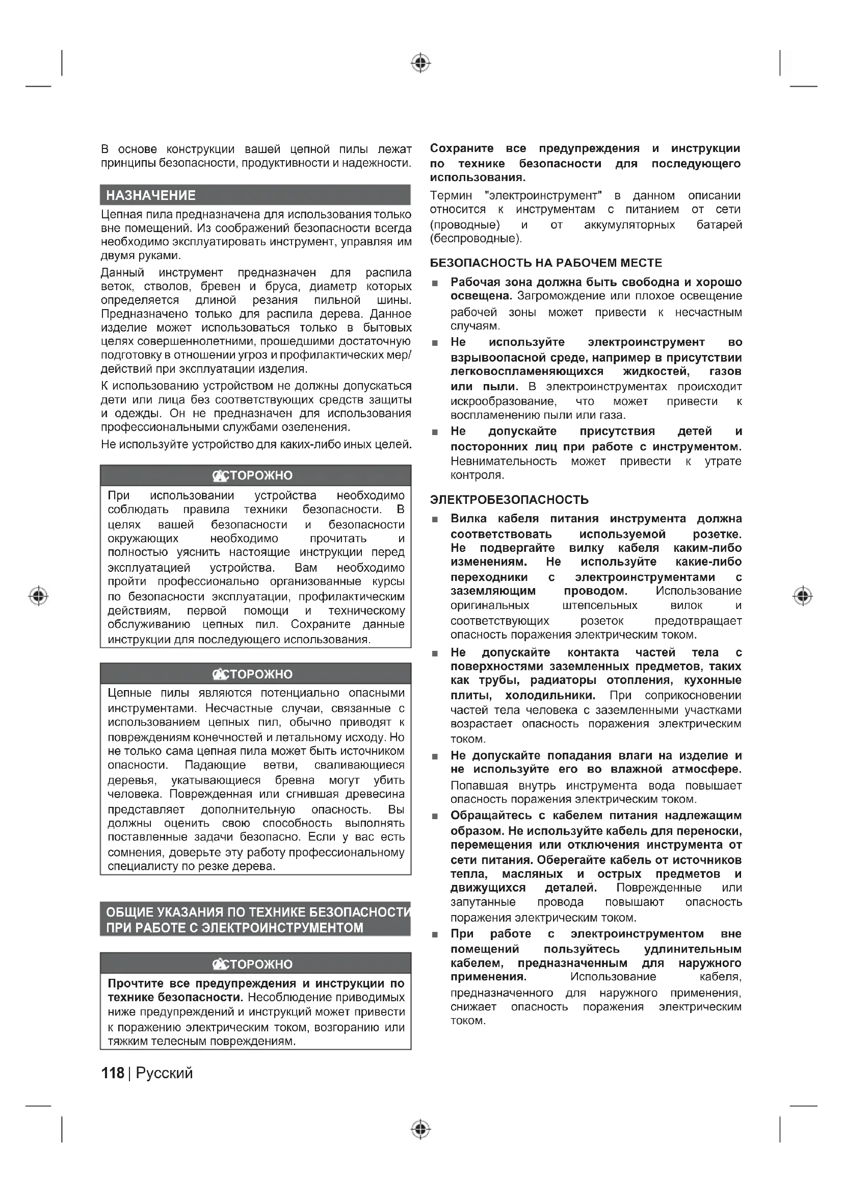 Цепные пилы являются потенциально опасными инструментами. Несчастные случаи, связанные с использованием цепных пил, обычно приводят к повреждениям конечностей и летальному исходу. Но не только сама цепная пила может быть источником опасности. Падающие ветви, сваливающиеся деревья, укатывающиеся бревна могут убить человека. Поврежденная или сгнившая древесина представляет дополнительную опасность. Вы должны оценить свою способность выполнять поставленные задачи безопасно. Если у вас есть сомнения, доверьте эту работу профессиональному специалисту по резке дерева. ОБЩИЕ УКАЗАНИЯ ПО ТЕХНИКЕ БЕЗОПАСНОСТИ ПРИ РАБОТЕ С ЭЛЕКТРОИНСТРУМЕНТОМ