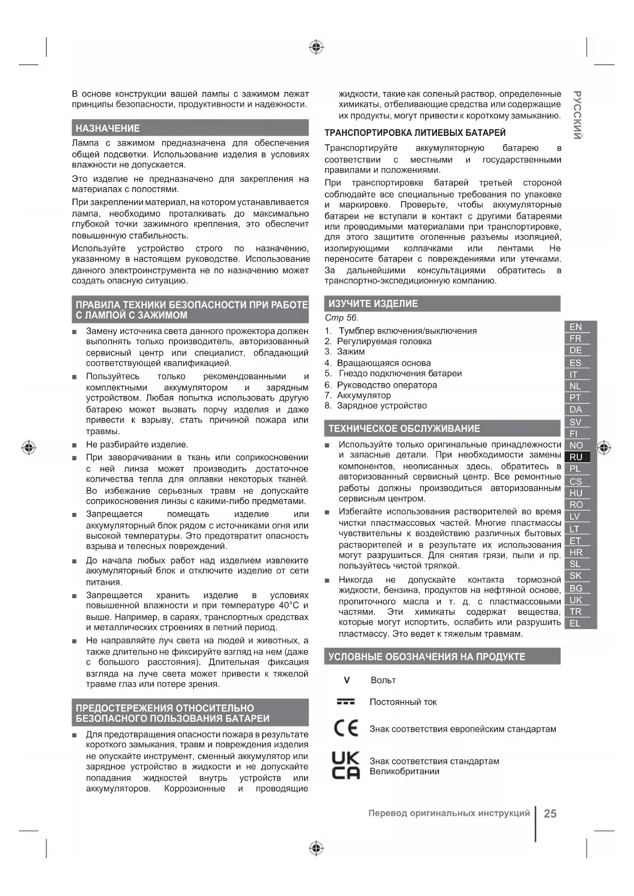 ELПеред использованием прибора внимательно ознакомьтесь с данной инструкцией. Нельзя длительно фиксировать взгляд на источнике света. Класс защиты III Утилизация аккумуляторов, электрического и электронного оборудования в месте с несортированными бытовыми отходами не допускается. Сбор аккумуляторов, электрического и электронного оборудования в целях утилизации должен осуществляться отдельно. Перед утилизацией необходимо извлечь из оборудования элементы питания, аккумуляторы и источники света. Уточните порядок утилизации и местонахождения пункта приема у местных властей или поставщика. Ритейлеры могут быть обязаны бесплатно принимать аккумуляторы, электрическое и электронное оборудование на утилизацию в соответствии с местными регламентами. Ваш вклад в повторную переработку аккумуляторов, а также электрического и электронного оборудования позволит сократить потребность в сырье. Аккумуляторы, в частности, содержащие литий, а также электрическое и электронное оборудование содержит ценные и подлежащие повторной переработке материалы, которые в случае ненадлежащей утилизации способны вредить экологии и здоровью людей. Перед утилизацией удалите с оборудования все персональные данные. ОБОЗНАЧЕНИЯ В РУКОВОДСТВЕ