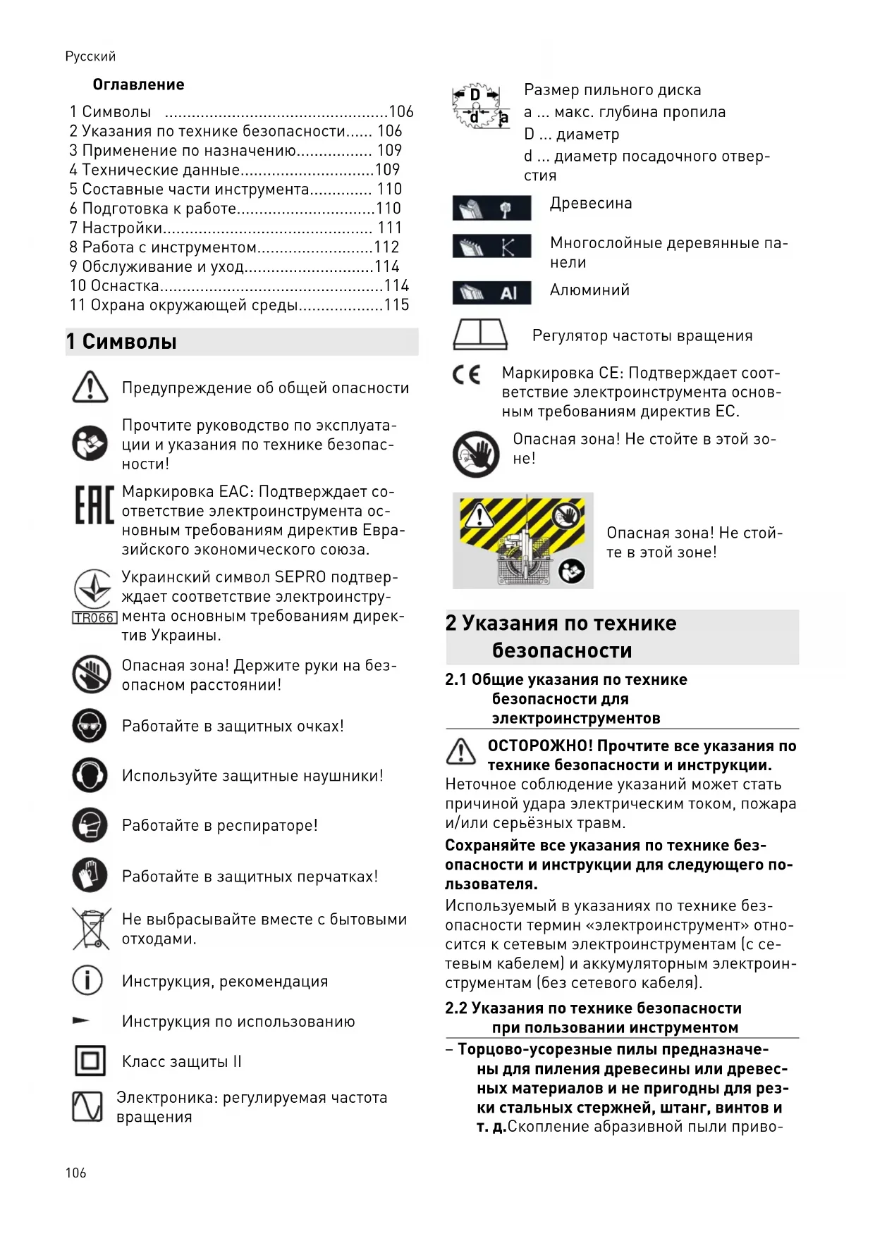 Маркировка EAC: Подтверждает со ответствие электроинструмента ос новным требованиям директив Евра зийского экономического союза. TR066 Украинский символ SEPRO подтвер ждает соответствие электроинстру мента основным требованиям дирек тив Украины. Опасная зона! Держите руки на без опасном расстоянии! Работайте в защитных очках! Используйте защитные наушники! Работайте в респираторе! Работайте в защитных перчатках! Не выбрасывайте вместе с бытовыми