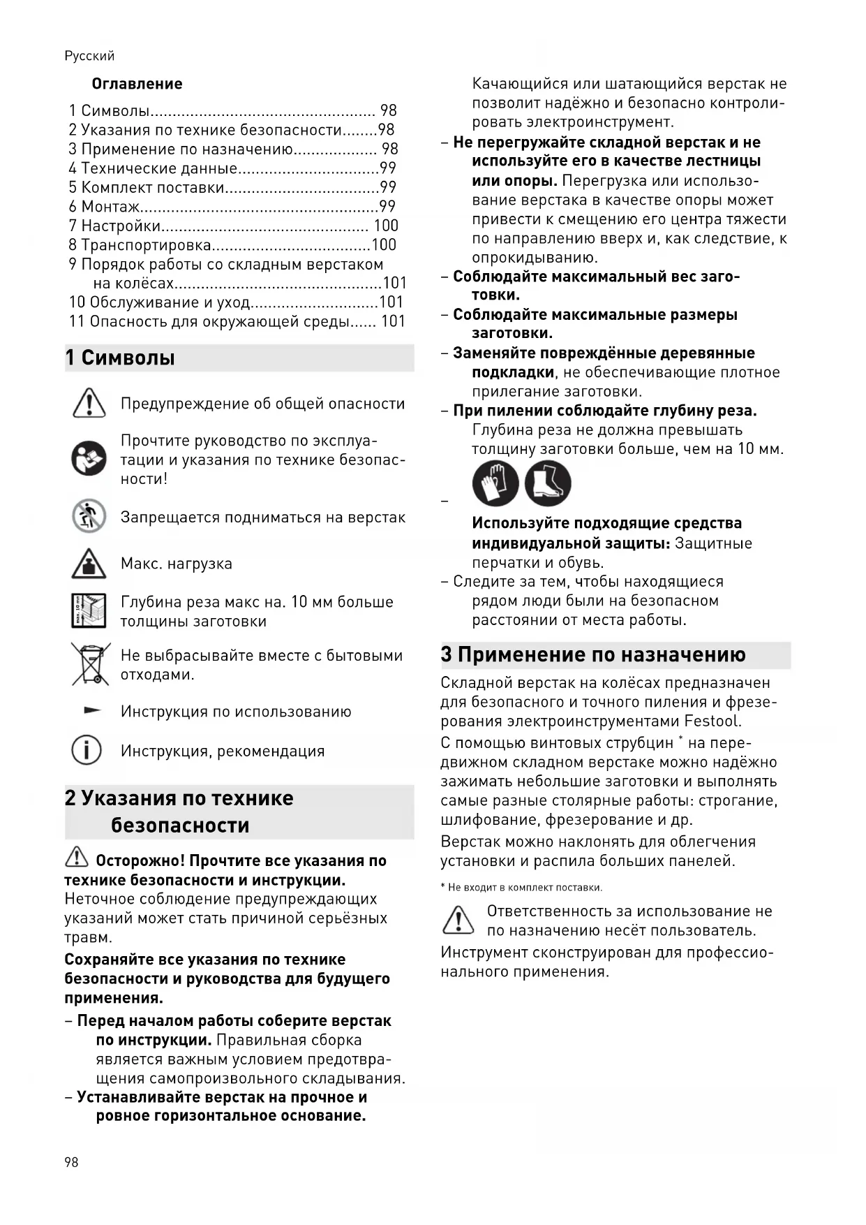 Сохраняйте все указания по технике безопасности и руководства для будущего применения. – Перед началом работы соберите верстак по инструкции. Правильная сборка является важным условием предотвра щения самопроизвольного складывания. – Устанавливайте верстак на прочное и ровное горизонтальное основание. Качающийся или шатающийся верстак не позволит надёжно и безопасно контроли ровать электроинструмент. – Не перегружайте складной верстак и не используйте его в качестве лестницы или опоры. Перегрузка или использо вание верстака в качестве опоры может привести к смещению его центра тяжести по направлению вверх и, как следствие, к опрокидыванию. – Соблюдайте максимальный вес заго