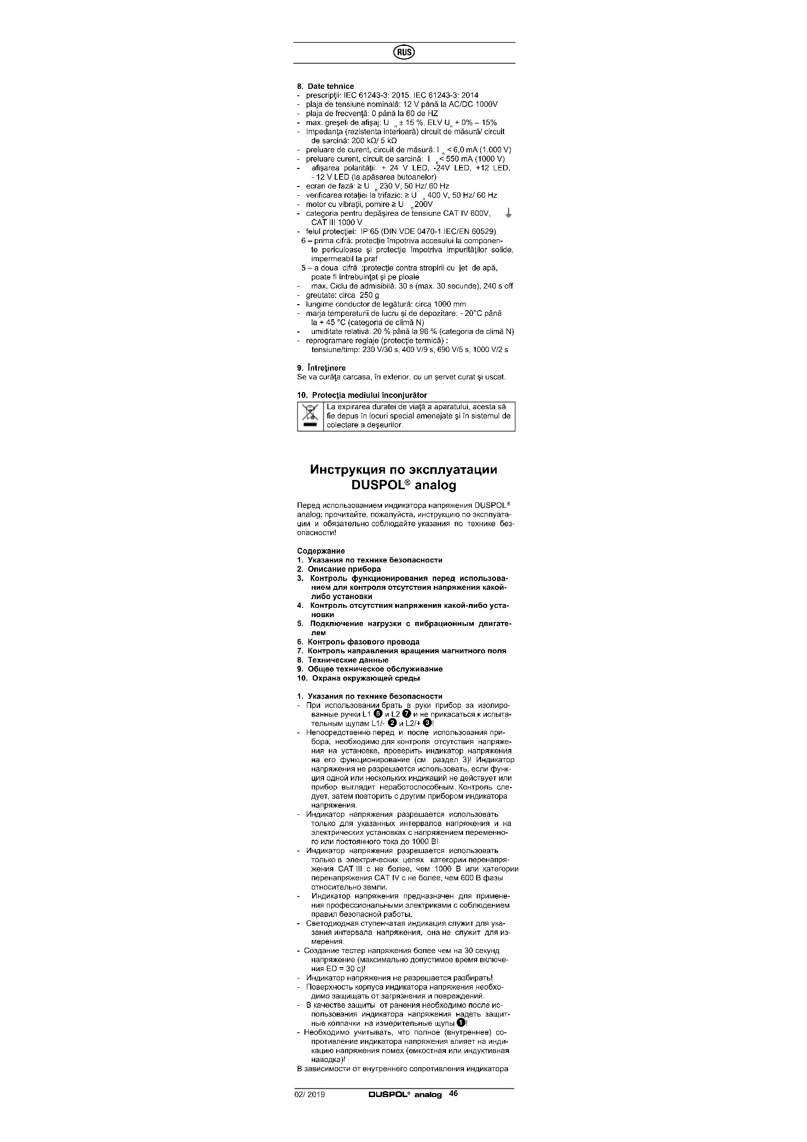 Проверка вращения магнитного поля возможна в трехфаз- ных сетях с напряжением более 400 B - 900 В, 50/60 Гц (фаза относительно фазы). Спецодежда и условия изоля- ции местоположения могут нарушить функцию.02/ 2019 DUSPOL