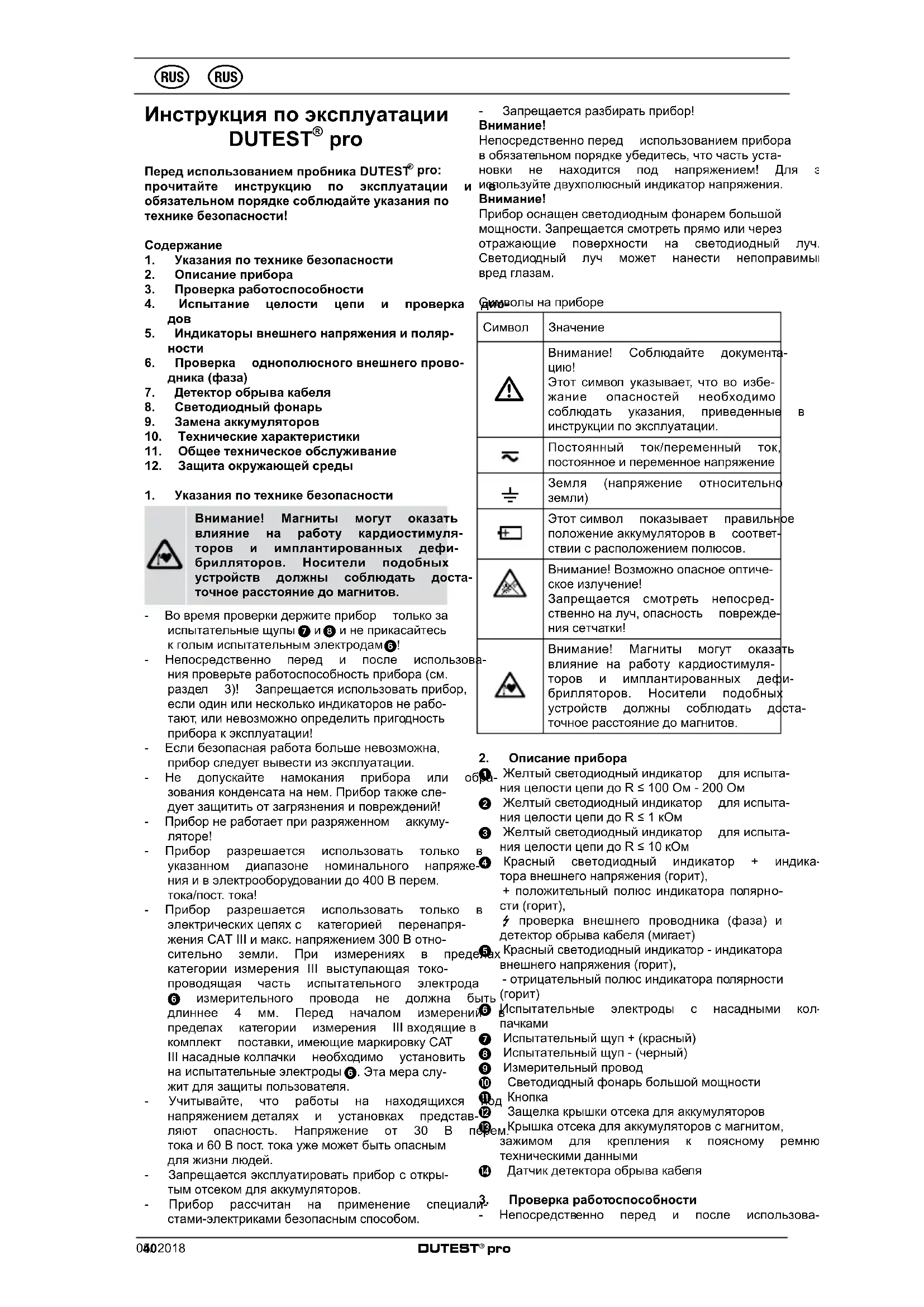 По окончании срока службы передайте использованныеаккумуляторыиприборв пунктывозвратаисбора.05/ 2018 DUTEST