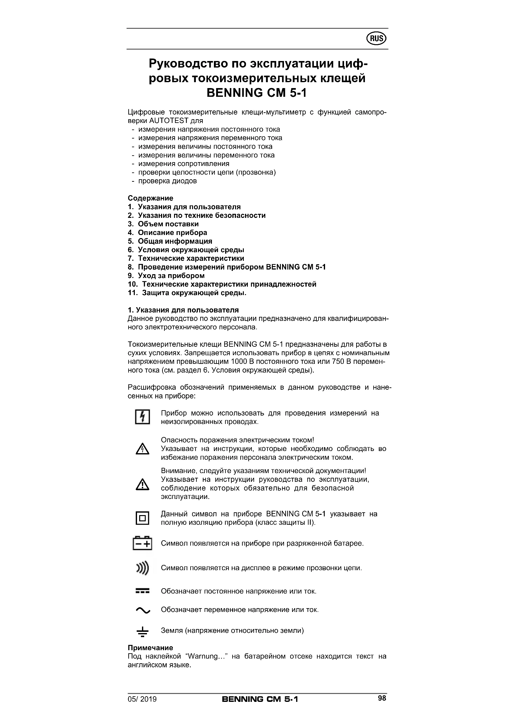Данное руководство по эксплуатации предназначено для квалифицирован- ного электротехнического персонала. Токоизмерительные клещи BENNING CM 5-1 предназначены для работы в сухих условиях. Запрещается использовать прибор в цепях с номинальным напряжением превышающим 1000 В постоянного тока или 750 В перемен- ного тока (см. раздел 6. Условия окружающей среды). Расшифровка обозначений применяемых в данном руководстве и нане- сенных на приборе: Прибор можно использовать для проведения измерений на неизолированных проводах.