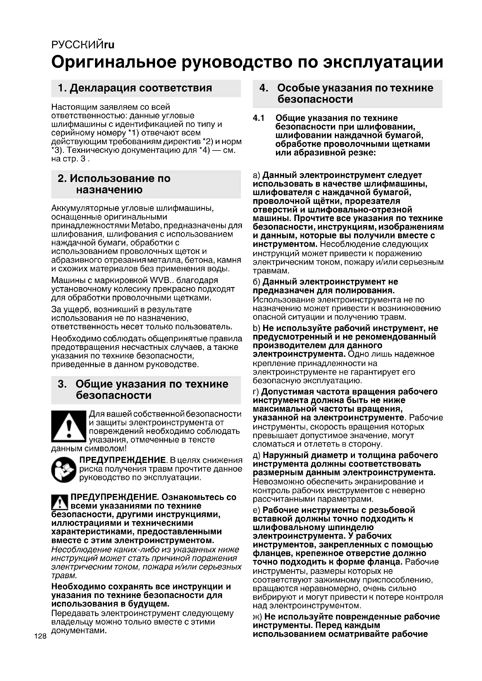 Оригинальное руководство по эксплуатации Настоящим заявляем со всей ответственностью: данные угловые шлифмашины с идентификацией по типу и серийному номеру *1) отвечают всем действующим требованиям директив *2) и норм *3). Техническую документацию для *4) — см. на стр.3. Аккумуляторные угловые шлифмашины, оснащенные оригинальными принадлежностями Metabo, предназначены для шлифования, шлифования с использованием наждачной бумаги, обработки с использованием проволочных щеток и абразивного отрезания металла, бетона, камня и схожих материалов без применения воды. Машины с маркировкой WVB.. благодаря установочному колесику прекрасно подходят для обработки проволочными щетками. За ущерб, возникший в результате использования не по назначению, ответственность несет только пользователь. Необходимо соблюдать общепринятые правила предотвращения несчастных случаев, а также указания по технике безопасности, приведенные в данном руководстве