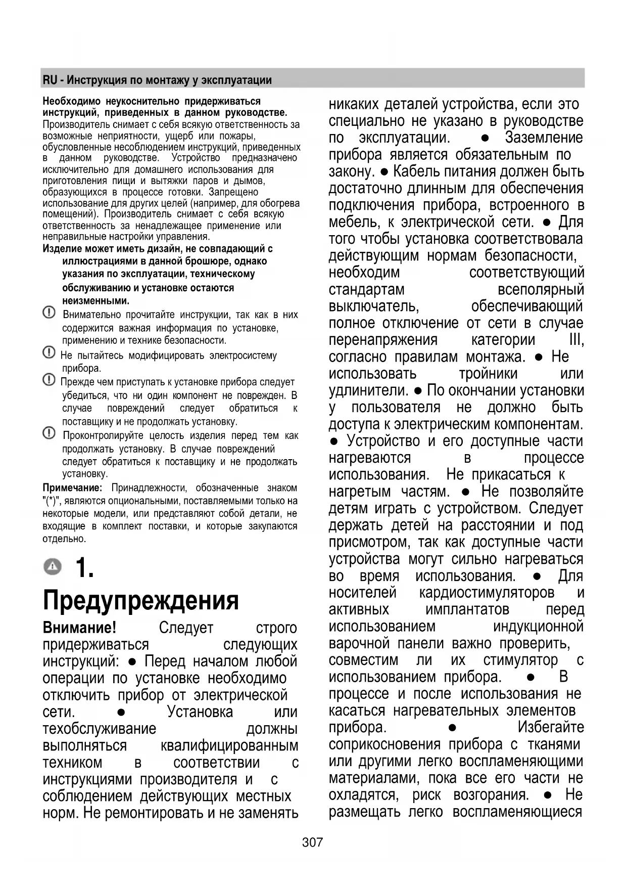 Предупреждения Внимание! Следует строго придерживаться следующих инструкций: ● Перед началом любой операции по установке необходимо отключить прибор от электрической сети. ● Установка или техобслуживание должны выполняться квалифицированным техником в соответствии с инструкциями производителя и с соблюдением действующих местных норм. Не ремонтировать и не заменять никаких деталей устройства, если это специально не указано в руководстве по эксплуатации. ● Заземление прибора является обязательным по закону. ● Кабель питания должен быть достаточно длинным для обеспечения подключения прибора, встроенного в мебель, к электрической сети. ● Для того чтобы установка соответствовала действующим нормам безопасности, необходим соответствующий стандартам всеполярный выключатель, обеспечивающий полное отключение от сети в случае перенапряжения категории III, согласно правилам монтажа. ● Не использовать тройники или удлинители. ● По окончании установки у пользователя не должно быть доступа к электрическим компонентам. ● Устройство и его доступные части нагреваются в процессе использования. Не прикасаться к нагретым частям. ● Не позволяйте детям играть с устройством. Следует держать детей на расстоянии и под присмотром, так как доступные части устройства могут сильно нагреваться во время использования. ● Для носителей кардиостимуляторов и активных имплантатов перед использованием индукционной варочной панели важно проверить, совместим ли их стимулятор с использованием прибора. ● В процессе и после использования не касаться нагревательных элементов прибора. ● Избегайте соприкосновения прибора с тканями или другими легко воспламеняющими материалами, пока все его части не охладятся, риск возгорания. ● Не размещать легко воспламеняющиеся308 материалы на приборе или вблизи него. ● При сильном нагревании жиры и масла легко воспламеняются. Необходимо следить за приготовлением продуктов с большим содержанием жиров и масла. - Если на поверхности имеются трещины, следует выключить прибор во избежание поражения электрическим током. ● Прибор не предназначен для включения через внешний таймер или отдельную систему дистанционного управления. ● Готовка без присмотра на варочной панели с использованием растительного масла или жира опасна и может привести к пожару. ● За приготовлением пищи нужно следить. Процесс быстрой готовки должен проходить под постоянным надзором. ● НИКОГДА не пытайтесь гасить огонь водой. Следует выключить прибор и погасить огонь, например, при помощи крышки или противопожарного одеяла. Опасность пожара: не кладите предметы на варочную поверхность. ● Не применяйте системы очистки паром, риск удара электрическим током. ● Не кладите металлические предметы, такие как ножи, вилки, ложки и крышки на варочную поверхность, так как они могут сильно нагреться. ● Перед подключением прибора к электросети: проверьте табличку с данными (расположенную в нижней части прибора), чтобы убедиться, что его напряжение и мощность соответствуют напряжению сети и что разъем для подключения подходящий. При возникновении сомнений следует обратиться к квалифицированному электрику. Важно: ● После использования выключить варочную панель при помощи соответствующего устройства управления, не полагаясь на детектор 
