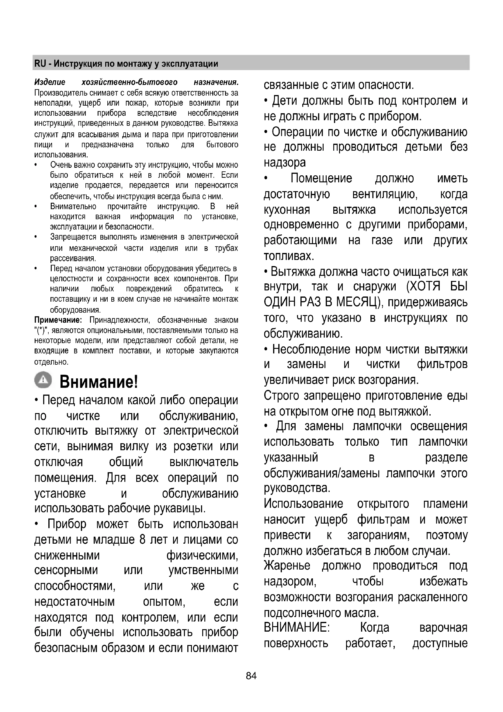 - Для замены лампочки освещения использовать только тип лампочки указанный в разделе обслуживания/замены лампочки этого руководства. Использование открытого пламени наносит ущерб фильтрам и может привести к загораниям, поэтому должно избегаться в любом случаи. Жаренье должно проводиться под надзором, чтобы избежать возможности возгорания раскаленного подсолнечного масла. ВНИМАНИЕ: Когда варочная поверхность работает, доступные85 части вытяжки могут нагреваться.