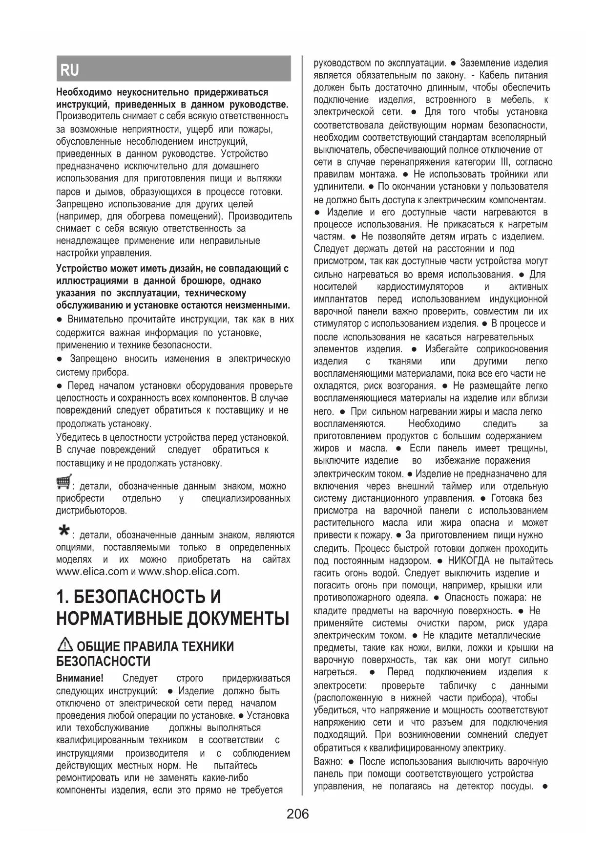 Dacă după verificările de mai sus defecţiunea persistă, contactaţi cel mai apropiat Serviciu de asistenţă tehnică. 205RU Необходимо неукоснительно придерживаться инструкций, приведенных в данном руководстве. Производитель снимает с себя всякую ответственность за возможные неприятности, ущерб или пожары, обусловленные несоблюдением инструкций, приведенных в данном руководстве. Устройство предназначено исключительно для домашнего использования для приготовления пищи и вытяжки паров и дымов, образующихся в процессе готовки. Запрещено использование для других целей (например, для обогрева помещений). Производитель снимает с себя всякую ответственность за ненадлежащее применение или неправильные настройки управления. Устройство может иметь дизайн, не совпадающий с иллюстрациями в данной брошюре, однако указания по эксплуатации, техническому обслуживанию и установке остаются неизменными. ● Внимательно прочитайте инструкции, так как в них содержится важная информация по установке, применению и технике безопасности. ● Запрещено вносить изменения в электрическую систему прибора. ● Перед началом установки оборудования проверьте целостность и сохранность всех компонентов. В случае повреждений следует обратиться к поставщику и не продолжать установку. Убедитесь в целостности устройства перед установкой. В случае повреждений следует обратиться к поставщику и не продолжать установку. : детали, обозначенные данным знаком, можно приобрести отдельно у специализированных дистрибьюторов. : детали, обозначенные данным знаком, являются опциями, поставляемыми только в определенных моделях и их можно приобретать на сайтах www.elica.com и www.shop.elica.com.