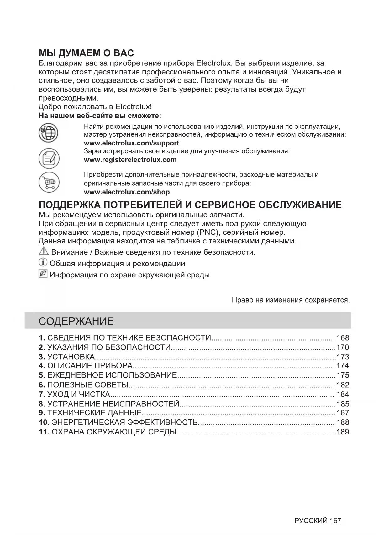 Reciclaţi materialele marcate cu simbolul . Pentru a recicla ambalajele, acestea trebuie puse în containerele corespunzătoare. Ajutaţi la protejarea mediului şi a sănătăţii umane şi la reciclarea deşeurilor din aparatele electrice şi electrocasnice. Nu aruncaţi aparatele marcate cu acest simbol împreună cu deşeurile menajere. Returnaţi produsul la centrul local de reciclare sau contactaţi administraţia oraşului dvs. 166 ROMÂNAМЫ ДУМАЕМ О ВАС Благодарим вас за приобретение прибора Electrolux. Вы выбрали изделие, за которым стоят десятилетия профессионального опыта и инноваций. Уникальное и стильное, оно создавалось с заботой о вас. Поэтому когда бы вы ни воспользовались им, вы можете быть уверены: результаты всегда будут превосходными. Добро пожаловать в Electrolux! На нашем веб-сайте вы сможете: Найти рекомендации по использованию изделий, инструкции по эксплуатации, мастер устранения неисправностей, информацию о техническом обслуживании: www.electrolux.com/support Зарегистрировать свое изделие для улучшения обслуживания: www.registerelectrolux.com Приобрести дополнительные принадлежности, расходные материалы и оригинальные запасные части для своего прибора: www.electrolux.com/shop ПОДДЕРЖКА ПОТРЕБИТЕЛЕЙ И СЕРВИСНОЕ ОБСЛУЖИВАНИЕ Мы рекомендуем использовать оригинальные запчасти. При обращении в сервисный центр следует иметь под рукой следующую информацию: модель, продуктовый номер (PNC), серийный номер. Данная информация находится на табличке с техническими данными. Внимание / Важные сведения по технике безопасности. Общая информация и рекомендации Информация по охране окружающей среды Право на изменения сохраняется.