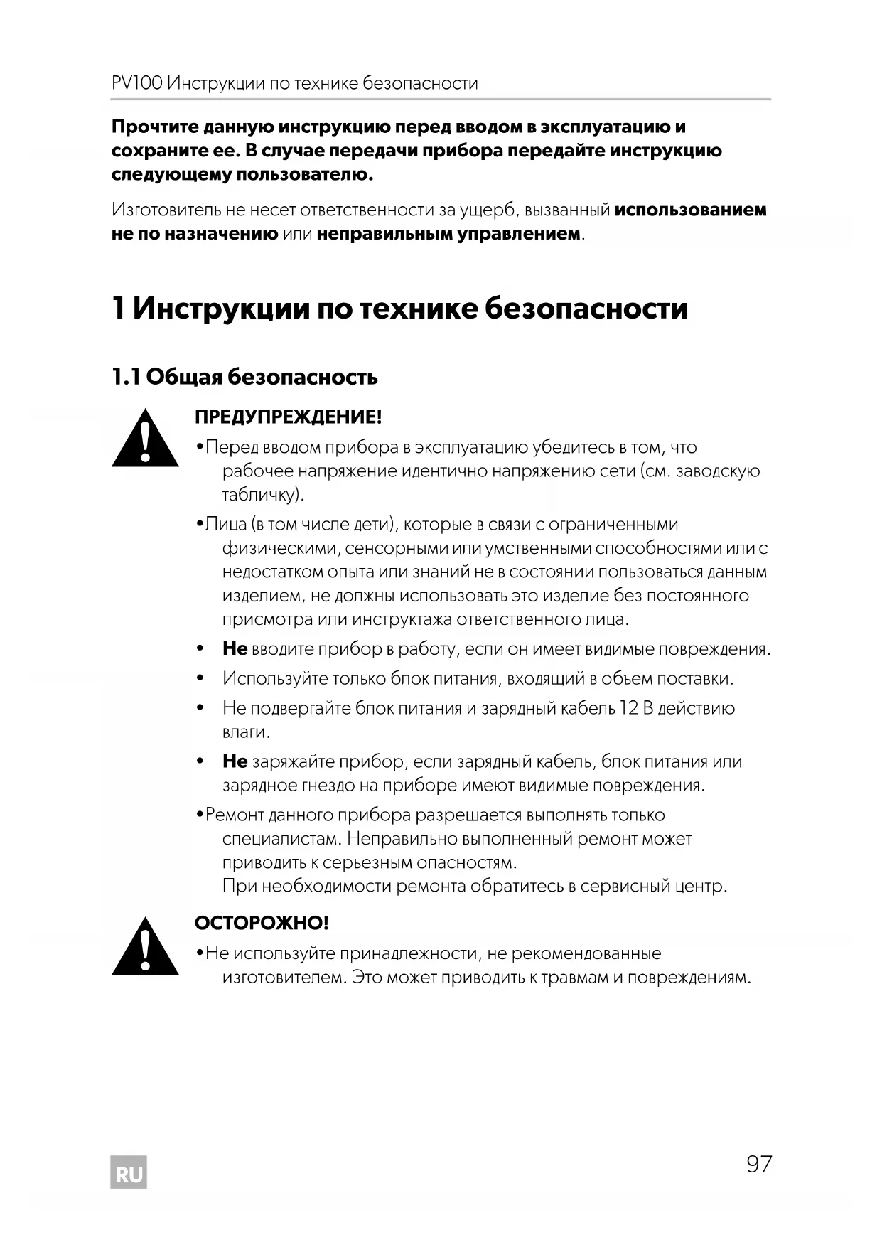 - Не используйте принадлежности, не рекомендованные изготовителем. Это может приводить к травмам и повреждениям. PV100-O-16s.book Seite 97 Montag, 29. August 2016 3:47 15RU Инструкции по технике безопасности PV100