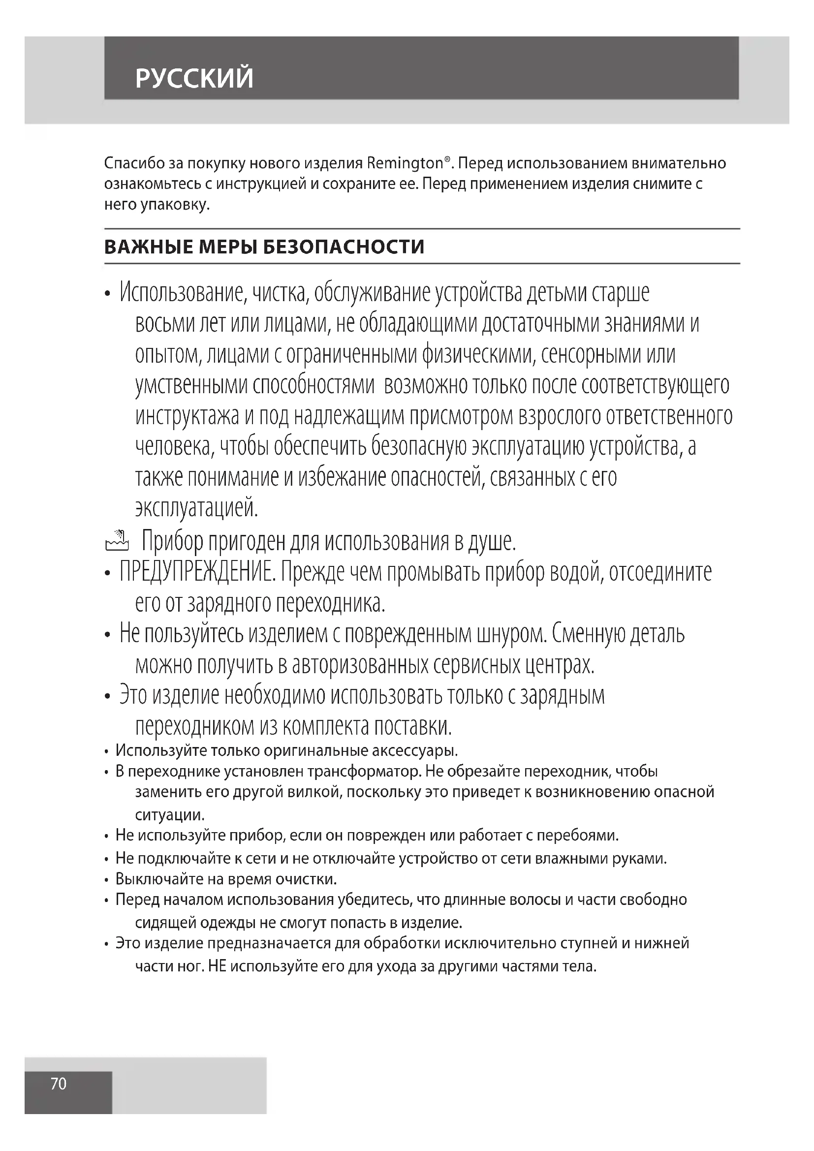 AE70 Спасибо за покупку нового изделия Remington®. Перед использованием внимательно ознакомьтесь с инструкцией и сохраните ее. Перед применением изделия снимите с него упаковку. ВАЖНЫЕ МЕРЫ БЕЗОПАСНОСТИ