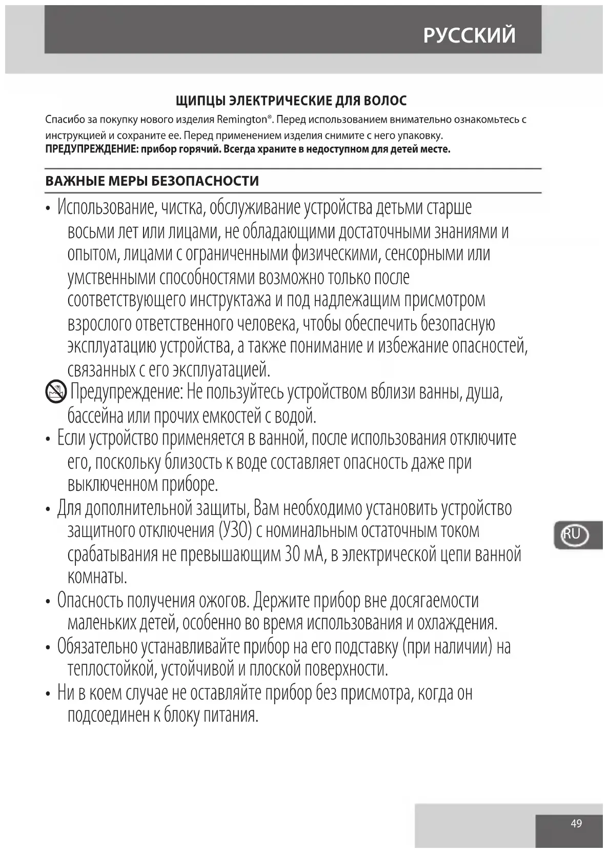 - При повреждении шнура следует немедленно прекратить использование устройства и вернуть устройство в ближайший авторизованный сервисный центр Remington® для ремонта или замены, чтобы избежать опасности.