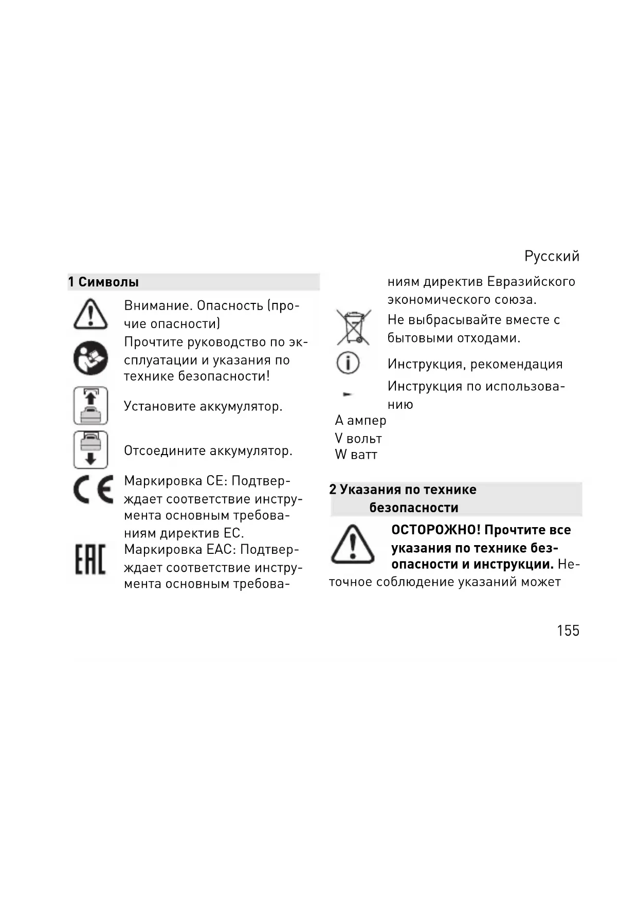 A ампер V вольт W ватт 2 Указания по технике безопасности ОСТОРОЖНО! Прочтите все указания по технике без опасности и инструкции. Не точное соблюдение указаний может