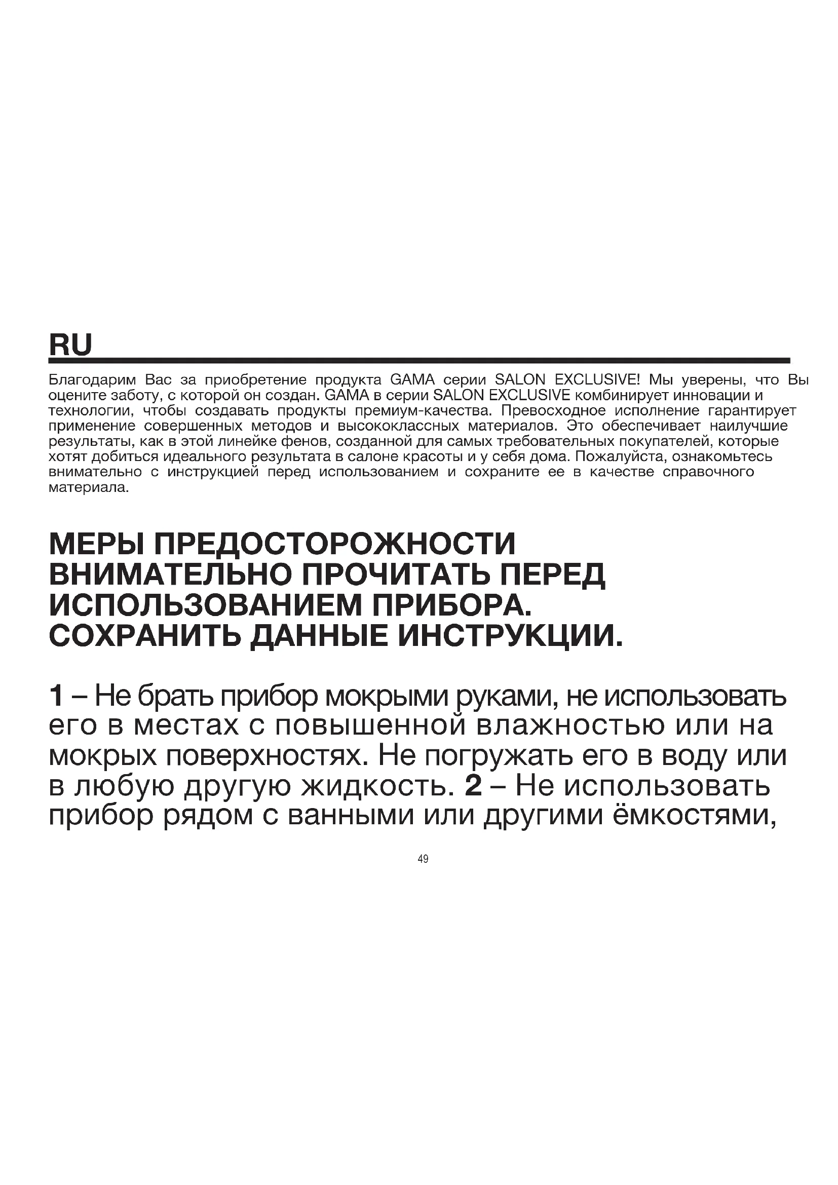 Используйте только оригинальные аксессуары GAMA. ЧИСТКА И ОБСЛУЖИВАНИЕ: Все фены снабжены инновационной системой, которая препятствует попаданию волос в части мотора. Правильный уход за продуктом позволяет поддерживать эффективную работу и продлить срок службы продукта. Прежде чем приступить к чистке прибора, отключите его от розетки и подождите, пока он