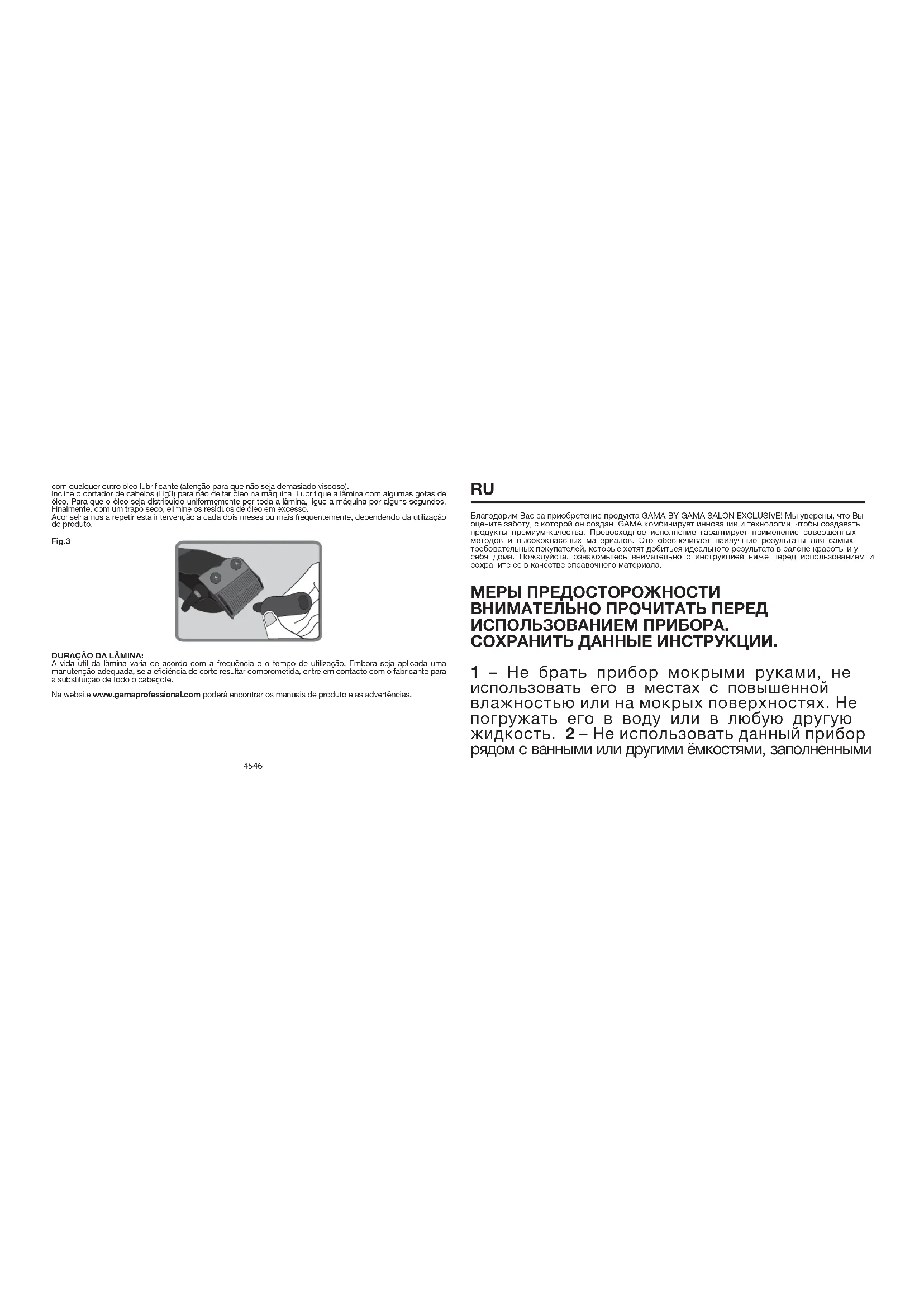 Перед первым использованием прибора смажьте его лезвие. Прочтите инструкцию в разделе «КАК И КОГДА СМАЗЫВАТЬ ЛЕЗВИЕ». ИНСТРУКЦИИ ПО ИСПОЛЬЗОВАНИЮ Установите желаемую насадку. Это действие всегда должно выполняться, когда прибор выключен. Включите машинку для стрижки, нажав на кнопку (O/I). Выключите машинку для стрижки, нажав на кнопку (O/I). УСТАНОВКА НАСАДОК Направляющие гребни в комплекте имеют по две защелки для крепления. Одна из них расположена рядом с зубцами гребня (Рис.1), другая – у его основания (рис. 2). Чтобы установить направляющий гребень на машинку для стрижки, установите защелку, расположенную рядом с зубцами гребня, на лезвие машинки для стрижки, и нажмите на основание гребня до характерного слабого щелчка: установка насадки завершена. Снимите насадку, потянув с небольшим усилием за выступ, расположенный у основания насадки. Рис.1 Рис.2 НАСТРОЙКА ДЛИНЫ СТРИЖКИ При использовании без насадок машинку GC910 можно настроить на длину стрижки от 0,9 мм (рычаг вверх) и 2 мм (рычаг вниз), а при помощи дополнительных насадок можно выполнять классические стрижки следующей длины: 3,6,9 и 12 мм. ЧИСТКА И УХОД Регулярная чистка и смазка машинки значительно повышает ее мощность и точность. НЕ ПРОМЫВАТЬ ПРИБОР И ЕГО ЧАСТИ ПОД ПРОТОЧНОЙ ВОДОЙ. ЧИСТКА ГОЛОВКИ Перед операцией по чистке убедитесь, что прибор выключен и отключен от сети электропитания. Снимите насадки, если они были установлены. Используя специальную щеточку, удалите остатки волос, оставшиеся на лезвиях и задней части головки прибора. НИКОГДА НЕ РАЗБИРАЙТЕ БЛОК ЛЕЗВИЙ НА СОСТАВНЫЕ ЧАСТИ, ИНАЧЕ ПЕРЕСТАНЕТ ДЕЙСТВОВАТЬ ГАРАНТИЯ НА ВЕСЬ ПРОДУКТ. 53 54ΕΛΛ Ευχαριστούμε που επιλέξατε ένα προϊόν GAMA BY GAMA SALON EXCLUSIVE. Είμαστε σίγουροι πως θα εκτιμήσετε τη φροντίδα με την οποία σχεδιάστηκε και κατασκευάστηκε. Η έρευνα GAMA συνεχίζει πάντα να συνδυάζει την καινοτομία και την τεχνολογία για να δημιουργήσει προϊόντα ανώτερης ποιότητας, που δημιουργήθηκαν με τις πιο σύγχρονες τεχνικές και τα καλύτερα υλικά. Αυτό εξασφαλίζει τη βέλτιστη απόδοση, μελετημένη για τους πιο απαιτητικούς καταναλωτές που θέλουν άριστο αποτέλεσμα. Πριν από τη χρήση, διαβάστε προσεκτικά τις οδηγίες και διατηρείστε τις ΕΙΔΟΠΟΙΗΣΕΙΣ: ΔΙΑΒΑΣΤΕ ΠΡΟΣΕΚΤΙΚΑ ΠΡΙΝ ΧΡΗΣΙΜΟΠΟΙΗΣΕΤΕ ΤΗ ΣΥΣΚΕΥΗ. ΔΙΑΤΗΡΕΙΣΤΕ ΑΥΤΕΣ ΤΙΣ ΟΔΗΓΙΕΣ. 1 -Μη χρησιμοποιείτε τη συσκευή με βρεγμένα χέρια, σε υγρούς χώρους ή σε βρεγμένες επιφάνειες. Μη βυθίζετε σε νερό ή σε άλλα υγρά. 2 - Μη χρησιμοποιείτε αυτή τη συσκευή κοντά σε μπανιέρες ή σε άλλα δοχεία που περιέχουν νερό. 3 - Αποσυνδέστε τη συσκευή από την πρίζα όταν είναι σβηστή, γιατί η εγγύτητα σε νερό μπορεί να αποτελέσει κίνδυνο˙ να КАК И КОГДА СМАЗЫВАТЬ ЛЕЗВИЕ Перед первым использованием рекомендуем смазать лезвие каплей масла, которое поставляется в комплекте, или же любого другого масла для смазки (предварительно убедившись, что оно не слишком