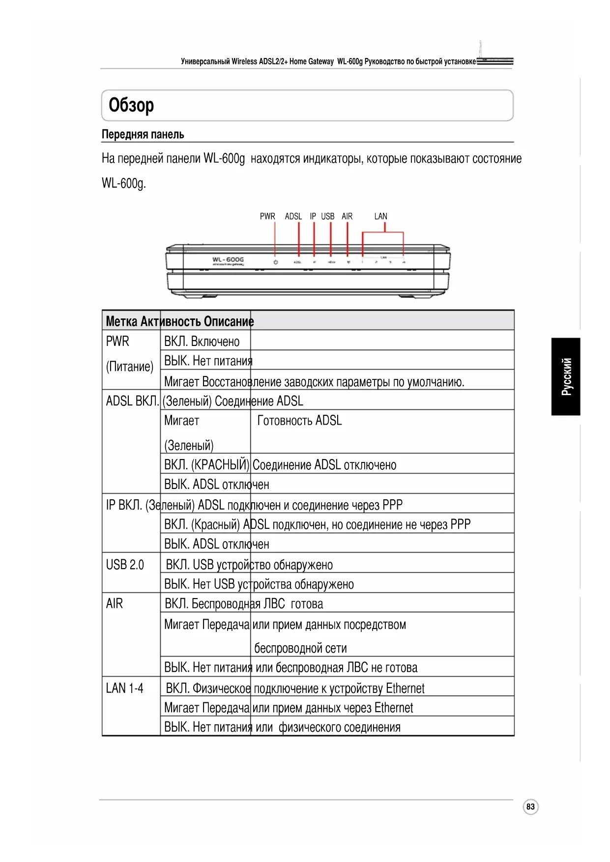Передняя панель На передней панели WL-600g находятся индикаторы, которые показывают состояние WL-600g. Метка Активность Описание PWR