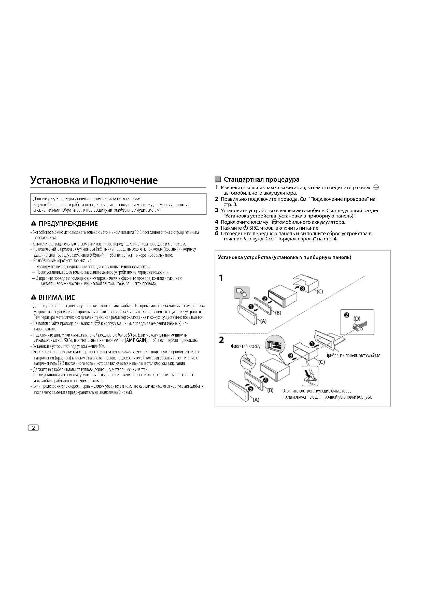 - La pressione di fa accedere direttamente ad BT AUDIO. 2 Avviare la riproduzione dal lettore audio tramite Bluetooth. Per Dal frontalinoRiproduzione/pausa Premere la manopola del volume.Selezionare un gruppo o una cartellaPremere 2 J / 1 K. Saltare all’indietro o in avantiPremere S / T. Avanzare o retrocedere rapidamentePremere a lungo S / T. RipetizionePremere 4 quante volte necessario. Riproduzione casualePremere 3 quante volte necessario. KD-X382BT_E_B5K-0867-00_IT.indd 7KD-X382BT_E_B5K-0867-00_IT.indd 7 2022/04/01 19:31:182022/04/01 19:31:182 Data Size: B6L (182 mm x 128 mm)Book Size: B6L (182 mm x 128 mm) Стандартная процедура 1 Извлеките ключ из замка зажигания, затем отсоедините разъем автомобильного аккумулятора. 2 Правильно подключите провода. См. “Подключение проводов” на стр.3. 3 Установите устройство в вашем автомобиле. См. следующий раздел “Установка устройства (установка в приборную панель)”. 4 Подключите клемму автомобильного аккумулятора. 5 Нажмите B SRC, чтобы включить питание. 6 Отсоедините переднюю панель и выполните сброс устройства в течение 5 секунд. См. “Порядок сброса” на стр.4. Установка устройства (установка в приборную панель) Установка и Подключение Данный раздел предназначен для специалиста по установке. В целях безопасности работа по подключению проводов и монтажу должна выполняться специалистами. Обратитесь к поставщику автомобильных аудиосистем. ПРЕДУПРЕЖДЕНИЕ