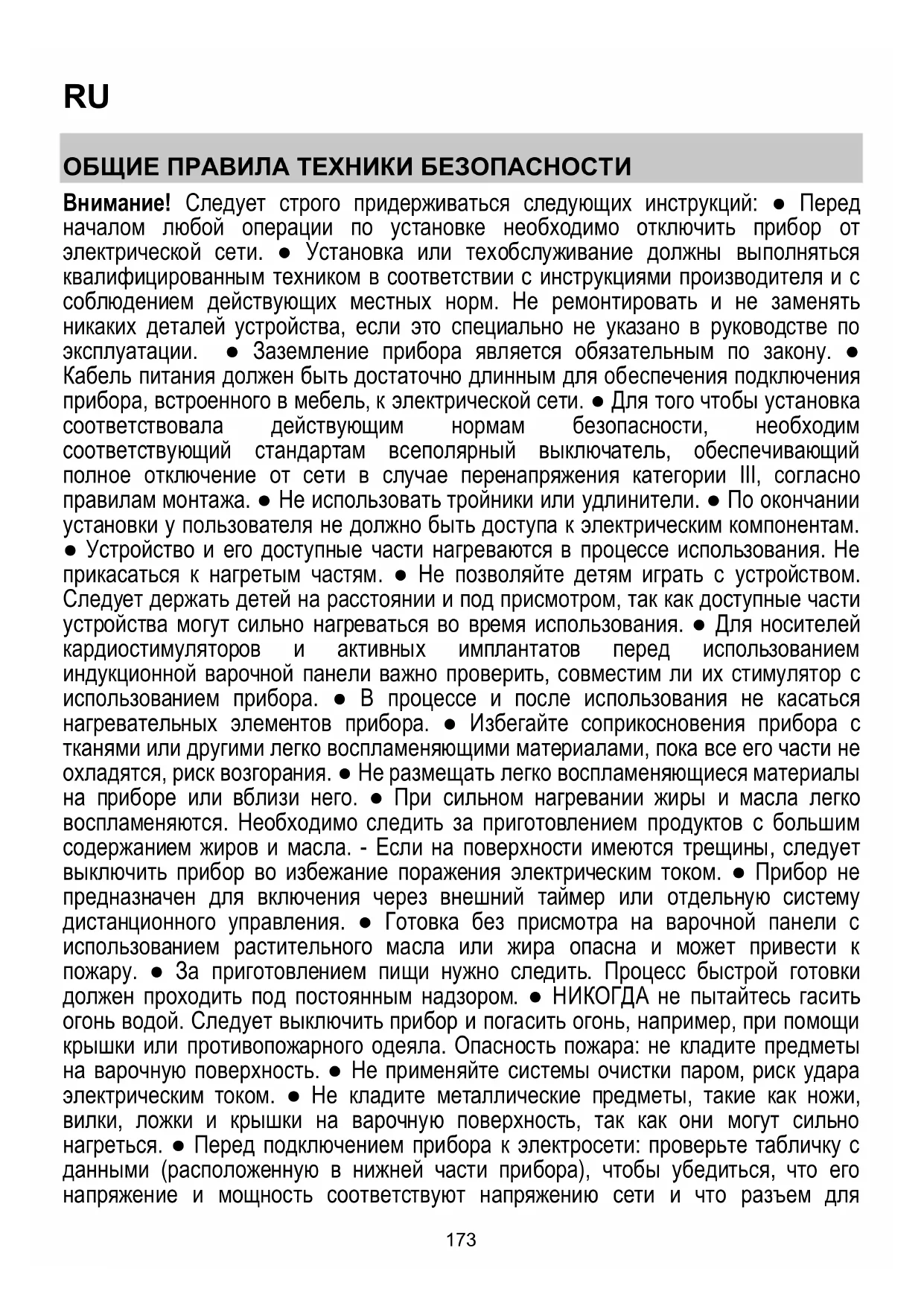 ОБЩИЕ ПРАВИЛА ТЕХНИКИ БЕЗОПАСНОСТИ Внимание! Следует строго придерживаться следующих инструкций: ● Перед началом любой операции по установке необходимо отключить прибор от электрической сети. ● Установка или техобслуживание должны выполняться квалифицированным техником в соответствии с инструкциями производителя и с соблюдением действующих местных норм. Не ремонтировать и не заменять никаких деталей устройства, если это специально не указано в руководстве по эксплуатации. ● Заземление прибора является обязательным по закону. ● Кабель питания должен быть достаточно длинным для обеспечения подключения прибора, встроенного в мебель, к электрической сети. ● Для того чтобы установка соответствовала действующим нормам безопасности, необходим соответствующий стандартам всеполярный выключатель, обеспечивающий полное отключение от сети в случае перенапряжения категории III, согласно правилам монтажа. ● Не использовать тройники или удлинители. ● По окончании установки у пользователя не должно быть доступа к электрическим компонентам. ● Устройство и его доступные части нагреваются в процессе использования. Не прикасаться к нагретым частям. ● Не позволяйте детям играть с устройством. Следует держать детей на расстоянии и под присмотром, так как доступные части устройства могут сильно нагреваться во время использования. ● Для носителей кардиостимуляторов и активных имплантатов перед использованием индукционной варочной панели важно проверить, совместим ли их стимулятор с использованием прибора. ● В процессе и после использования не касаться нагревательных элементов прибора. ● Избегайте соприкосновения прибора с тканями или другими легко воспламеняющими материалами, пока все его части не охладятся, риск возгорания. ● Не размещать легко воспламеняющиеся материалы на приборе или вблизи него. ● При сильном нагревании жиры и масла легко воспламеняются. Необходимо следить за приготовлением продуктов с большим содержанием жиров и масла. - Если на поверхности имеются трещины, следует выключить прибор во избежание поражения электрическим током. ● Прибор не предназначен для включения через внешний таймер или отдельную систему дистанционного управления. ● Готовка без присмотра на варочной панели с использованием растительного масла или жира опасна и может привести к пожару. ● За приготовлением пищи нужно следить. Процесс быстрой готовки должен проходить под постоянным надзором. ● НИКОГДА не пытайтесь гасить огонь водой. Следует выключить прибор и погасить огонь, например, при помощи крышки или противопожарного одеяла. Опасность пожара: не кладите предметы на варочную поверхность. ● Не применяйте системы очистки паром, риск удара электрическим током. ● Не кладите металлические предметы, такие как ножи, вилки, ложки и крышки на варочную поверхность, так как они могут сильно нагреться. ● Перед подключением прибора к электросети: проверьте табличку с данными (расположенную в нижней части прибора), чтобы убедиться, что его напряжение и мощность соответствуют напряжению сети и что разъем для174 подключения подходящий. При возникновении сомнений следует обратиться к квалифицированному электрику. Важно: ● После использования выключить варочную панель при помощи соответствующего устройства управления, не по