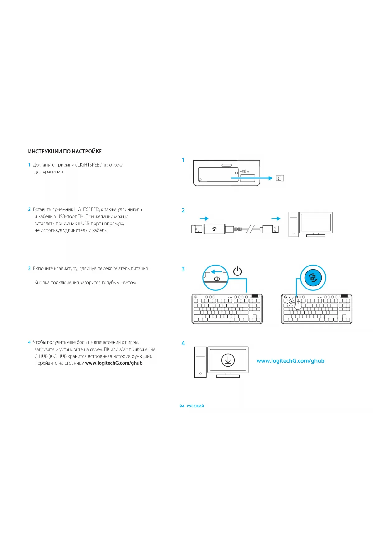 .94 РУССКИЙ ИНСТРУКЦИИ ПО НАСТРОЙКЕ 1 Достаньте приемник LIGHTSPEED из отсека дляхранения. 2 Вставьте приемник LIGHTSPEED, а также удлинитель икабель в USB-порт ПК. При желании можно вставлять приемник в USB-порт напрямую, неиспользуя удлинитель и кабель. 3 Включите клавиатуру, сдвинув переключатель питания. Кнопка подключения загорится голубым цветом. 4 Чтобы получить еще больше впечатлений от игры, загрузите и установите насвоем ПК или Mac приложение GHUB (в GHUB хранится встроенная история функций). Перейдите на страницу www.logitechG.com/ghub