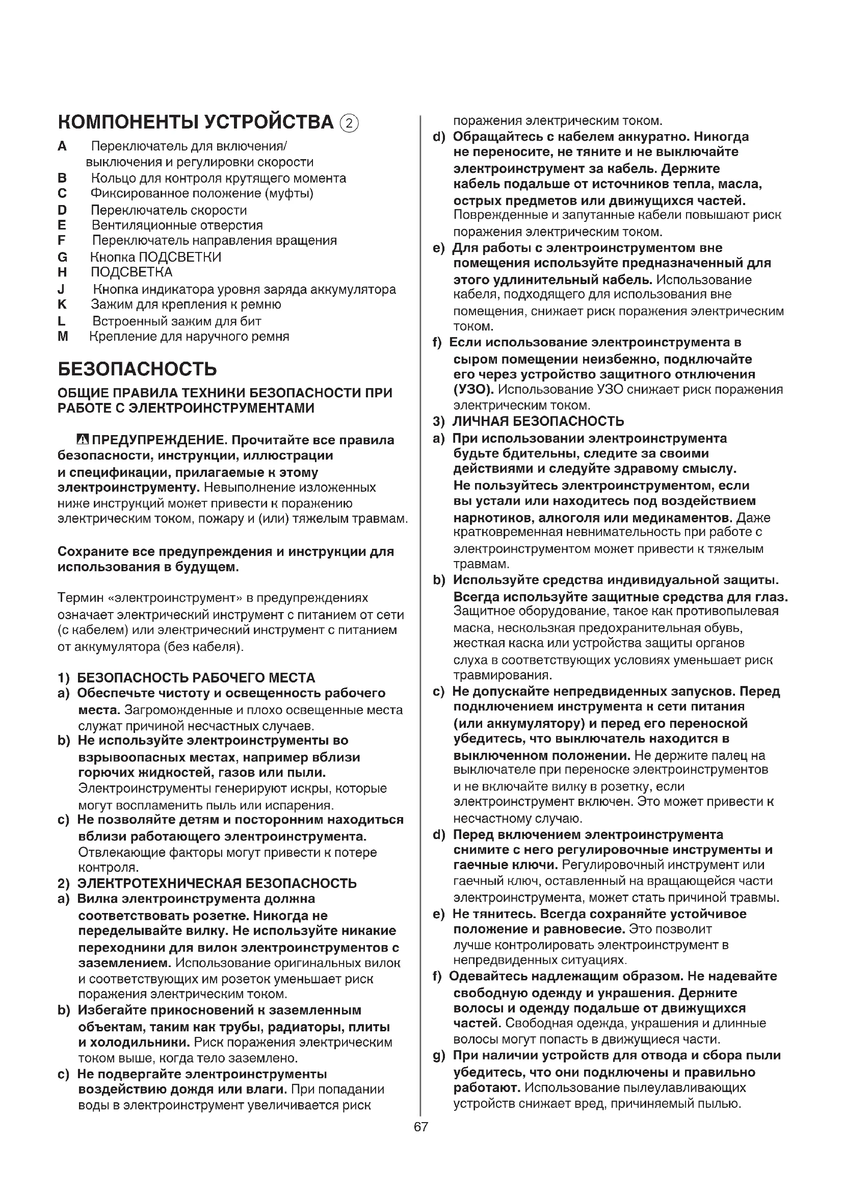 J Кнопка индикатора уровня заряда аккумулятора K Зажим для крепления к ремню L Встроенный зажим для бит M Крепление для наручного ремня БЕЗОПАСНОСТЬ ОБЩИЕ ПРАВИЛА ТЕХНИКИ БЕЗОПАСНОСТИ ПРИ РАБОТЕ С ЭЛЕКТРОИНСТРУМЕНТАМИ - ПРЕДУПРЕЖДЕНИЕ. Прочитайте все правила безопасности, инструкции, иллюстрации и спецификации, прилагаемые к этому электроинструменту. Невыполнение изложенных ниже инструкций может привести к поражению электрическим током, пожару и (или) тяжелым травмам. Сохраните все предупреждения и инструкции для использования в будущем. Термин «электроинструмент» в предупреждениях означает электрический инструмент с питанием от сети (с кабелем) или электрический инструмент с питанием от аккумулятора (без кабеля).
