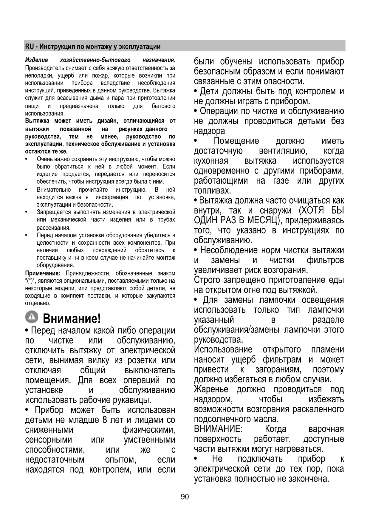- Для замены лампочки освещения использовать только тип лампочки указанный в разделе обслуживания/замены лампочки этого руководства. Использование открытого пламени наносит ущерб фильтрам и может привести к загораниям, поэтому должно избегаться в любом случаи. Жаренье должно проводиться под надзором, чтобы избежать возможности возгорания раскаленного подсолнечного масла. ВНИМАНИЕ: Когда варочная поверхность работает, доступные части вытяжки могут нагреваться.