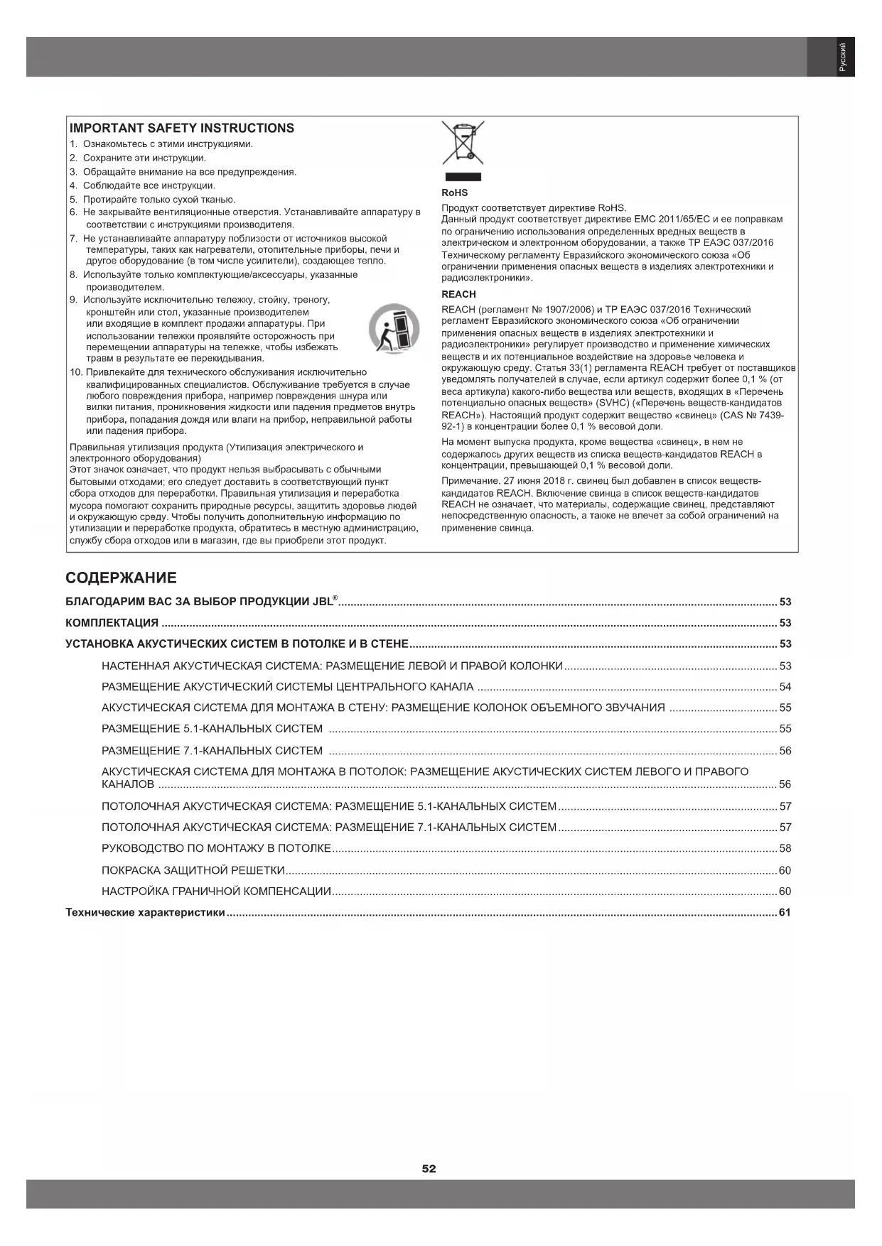 квалифицированных специалистов. Обслуживание требуется в случае любого повреждения прибора, например повреждения шнура или вилки питания, проникновения жидкости или падения предметов внутрь прибора, попадания дождя или влаги на прибор, неправильной работы или падения прибора. Правильная утилизация продукта (Утилизация электрического и электронного оборудования) Этот значок означает, что продукт нельзя выбрасывать с обычными бытовыми отходами; его следует доставить в соответствующий пункт сбора отходов для переработки. Правильная утилизация и переработка мусора помогают сохранить природные ресурсы, защитить здоровье людей и окружающую среду. Чтобы получить дополнительную информацию по утилизации и переработке продукта, обратитесь в местную администрацию, службу сбора отходов или в магазин, где вы приобрели этот продукт. RoHS Продукт соответствует директиве RoHS. Данный продукт соответствует директиве EMC 2011/65/EC и ее поправкам по ограничению использования определенных вредных веществ в электрическом и электронном оборудовании, а также ТР ЕАЭС 037/2016 Техническому регламенту Евразийского экономического союза «Об ограничении применения опасных веществ в изделиях электротехники и радиоэлектроники». REACH REACH (регламент № 1907/2006) и ТР ЕАЭС 037/2016 Технический регламент Евразийского экономического союза «Об ограничении применения опасных веществ в изделиях электротехники и радиоэлектроники» регулирует производство и применение химических веществ и их потенциальное воздействие на здоровье человека и окружающую среду. Статья 33(1) регламента REACH требует от поставщиков уведомлять получателей в случае, если артикул содержит более 0,1 % (от веса артикула) какого-либо вещества или веществ, входящих в «Перечень потенциально опасных веществ» (SVHC) («Перечень веществ-кандидатов REACH»). Настоящий продукт содержит вещество «свинец» (CAS № 7439- 92-1) в концентрации более 0,1 % весовой доли. На момент выпуска продукта, кроме вещества «свинец», в нем не содержалось других веществ из списка веществ-кандидатов REACH в концентрации, превышающей 0,1 % весовой доли. Примечание. 27 июня 2018 г. свинец был добавлен в список веществ- кандидатов REACH. Включение свинца в список веществ-кандидатов REACH не означает, что материалы, содержащие свинец, представляют непосредственную опасность, а также не влечет за собой ограничений на применение свинца.