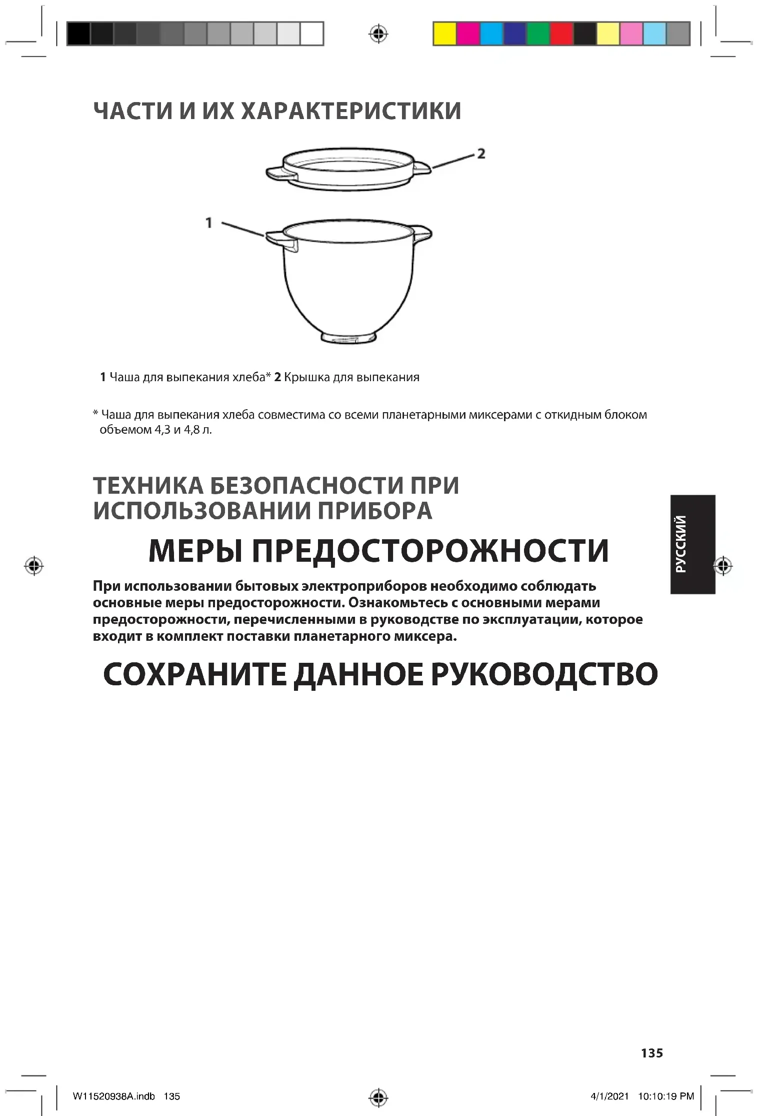 ЧАСТИ И ИХ ХАРАКТЕРИСТИКИ 1 Чаша для выпекания хлеба* 2 Крышка для выпекания ТЕХНИКА БЕЗОПАСНОСТИ ПРИ ИСПОЛЬЗОВАНИИ ПРИБОРА МЕРЫ ПРЕДОСТОРОЖНОСТИ При использовании бытовых электроприборов необходимо соблюдать основные меры предосторожности. Ознакомьтесь с основными мерами предосторожности, перечисленными в руководстве по эксплуатации, которое входит в комплект поставки планетарного миксера. СОХРАНИТЕ ДАННОЕ РУКОВОДСТВО