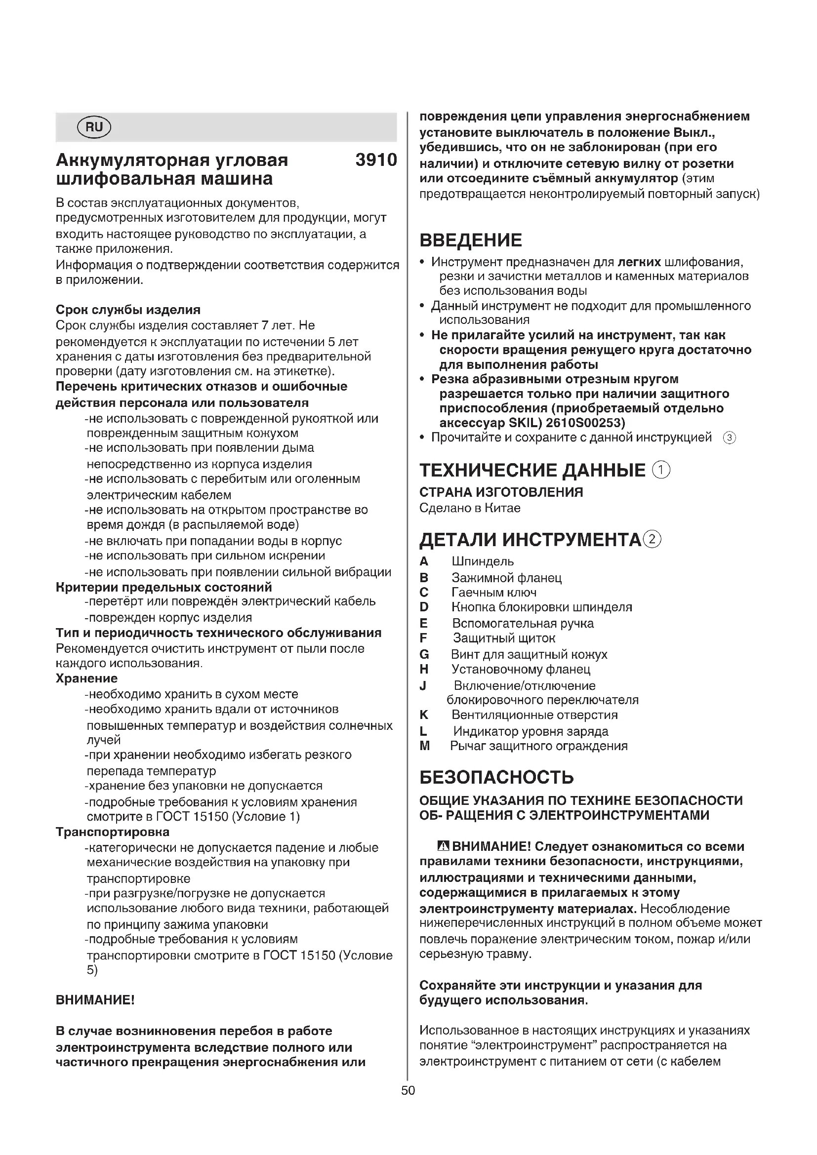 A Шпиндель B Зажимной фланец C Гаечным ключ D Кнопка блокировки шпинделя E Вспомогательная ручка F Защитный щиток G Винт для защитный кожух H Установочному фланец J Включение/отключение блокировочного переключателя K Вентиляционные отверстия L Индикатор уровня заряда M Рычаг защитного ограждения БЕЗОПАСНОСТЬ ОБЩИЕ УКАЗАНИЯ ПО ТЕХНИКЕ БЕЗОПАСНОСТИ ОБ- РАЩЕНИЯ С ЭЛЕКТРОИНСТРУМЕНТАМИ - ВНИМАНИЕ! Следует ознакомиться со всеми правилами техники безопасности, инструкциями, иллюстрациями и техническими данными, содержащимися в прилагаемых к этому электроинструменту материалах. Несоблюдение нижеперечисленных инструкций в полном объеме может повлечь поражение электрическим током, пожар и/или серьезную травму. Сохраняйте эти инструкции и указания для будущего использования. Использованное в настоящих инструкциях и указаниях понятие “электроинструмент” распространяется на электроинструмент с питанием от сети (с кабелем