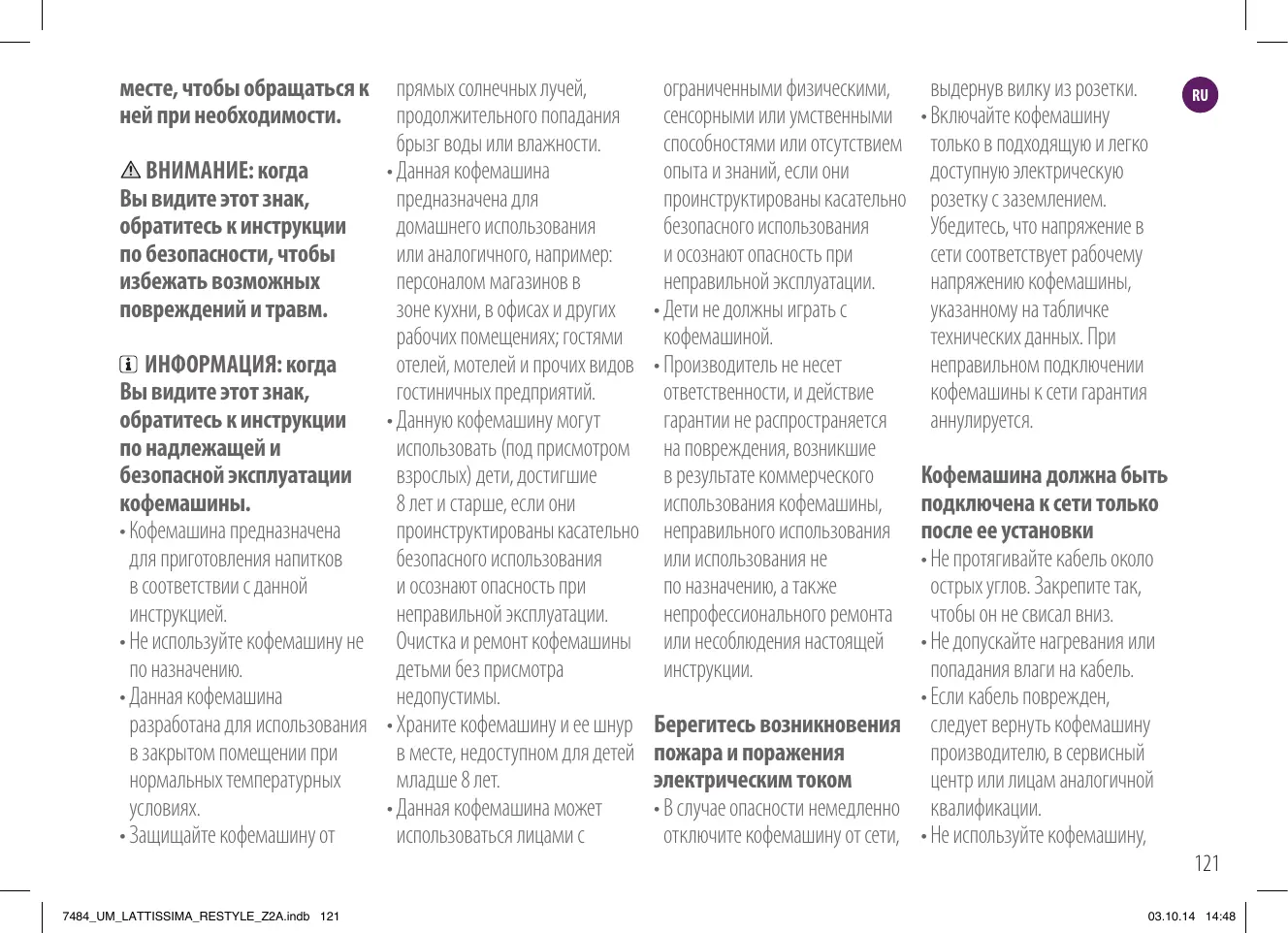 - Защищайте кофемашину от использоваться лицами с 7484_UM_LATTISSIMA_RESTYLE_Z2A.indb 121 ограниченными физическими, сенсорными или умственными способностями или отсутствием опыта и знаний, если они проинструктированы касательно безопасного использования и осознают опасность при неправильной эксплуатации.