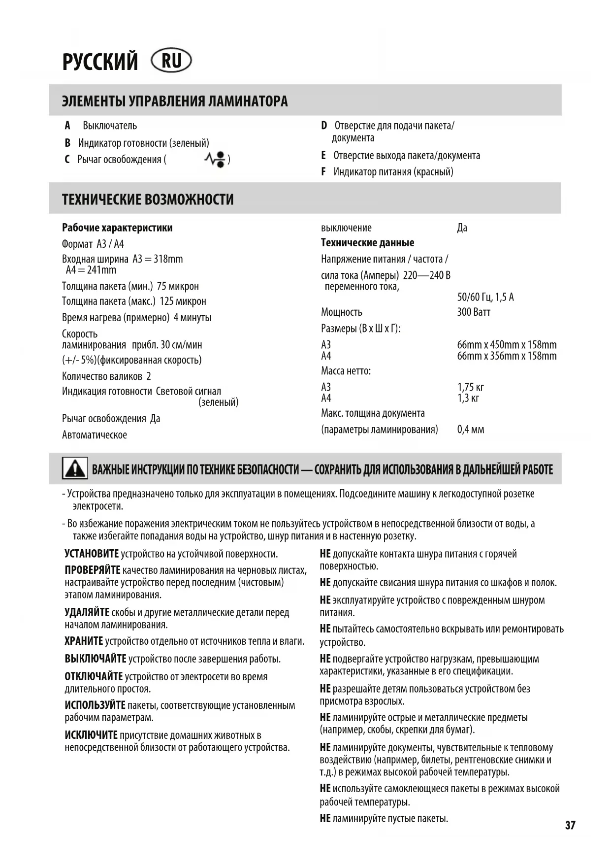 E Отверстие выхода пакета/документа F Индикатор питания (красный) ТЕХНИЧЕСКИЕ ВОЗМОЖНОСТИ - Устройства предназначено только для эксплуатации в помещениях. Подсоедините машину к легкодоступной розетке электросети. - Во избежание поражения электрическим током не пользуйтесь устройством в непосредственной близости от воды, а также избегайте попадания воды на устройство, шнур питания и в настенную розетку. УСТАНОВИТЕ устройство на устойчивой поверхности. ПРОВЕРЯЙТЕ качество ламинирования на черновых листах, настраивайте устройство перед последним (чистовым) этапом ламинирования. УДАЛЯЙТЕ скобы и другие металлические детали перед началом ламинирования. ХРАНИТЕ устройство отдельно от источников тепла и влаги. ВЫКЛЮЧАЙТЕ устройство после завершения работы. ОТКЛЮЧАЙТЕ устройство от электросети во время длительного простоя. ИСПОЛЬЗУЙТЕ пакеты, соответствующие установленным рабочим параметрам. ИСКЛЮЧИТЕ присутствие домашних животных в непосредственной близости от работающего устройства. НЕ допускайте контакта шнура питания с горячей поверхностью. НЕ допускайте свисания шнура питания со шкафов и полок. НЕ эксплуатируйте устройство с поврежденным шнуром