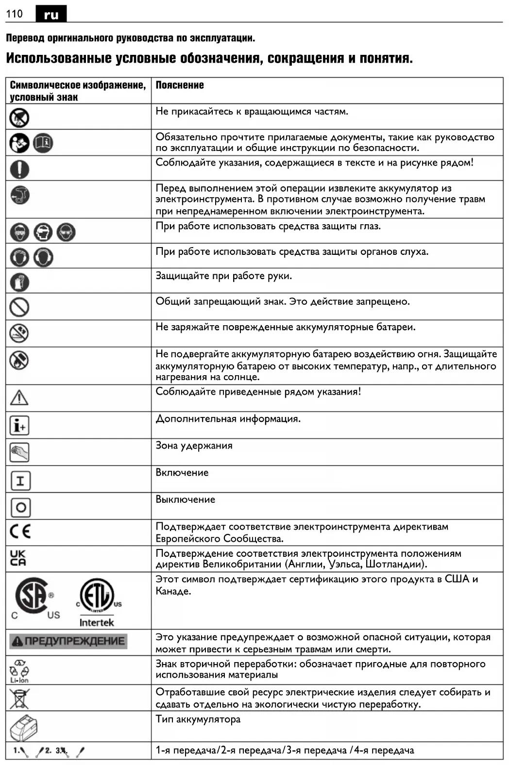 Это указание предупреждает о возможной опасной ситуации, которая может привести к серьезным травмам или смерти. Знак вторичной переработки: обозначает пригодные для повторного использования материалы Отработавшие свой ресурс электрические изделия следует собирать и сдавать отдельно на экологически чистую переработку. Тип аккумулятора 1-я передача/2-я передача/3-я передача /4-я передача
