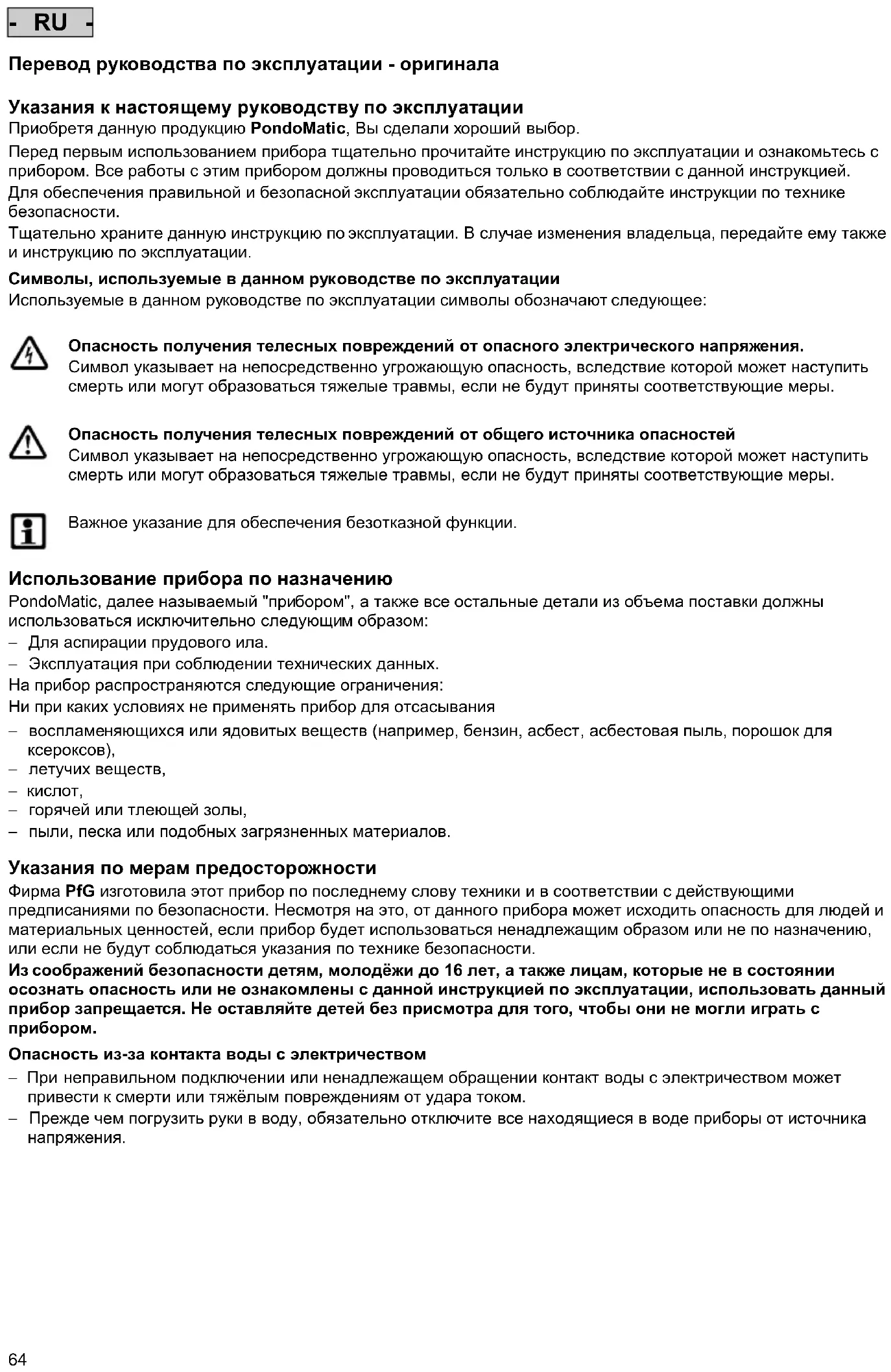 Скачайте инструкцию для вашего Пылесос в формате PDF бесплатно! Найдите своё руководство Pondomatic 3 - Pontec и возьмите своё электронное устройство обратно в руки. На этой странице опубликованы все документы, необходимые для использования вашего устройства. Pondomatic 3 бренда Pontec.