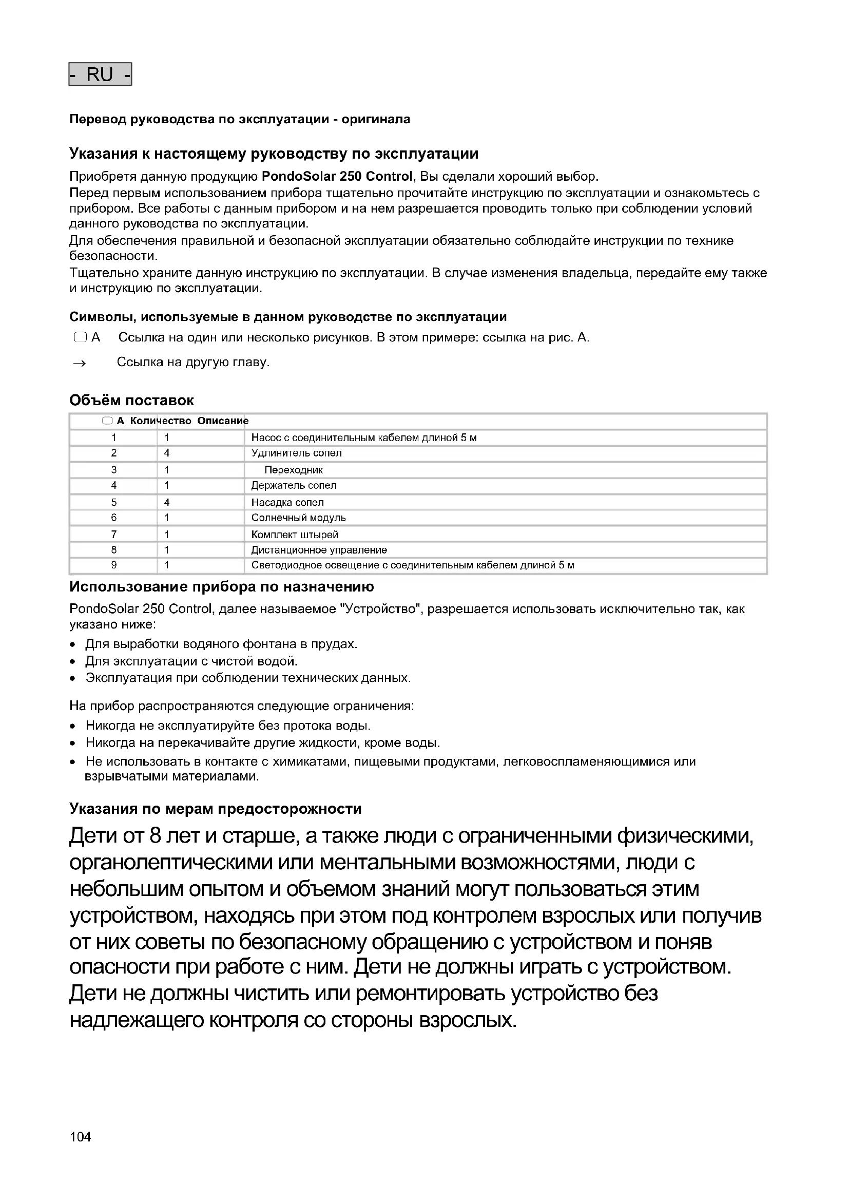 Указания к настоящему руководству по эксплуатации Приобретя данную продукцию PondoSolar 250 Control, Вы сделали хороший выбор. Перед первым использованием прибора тщательно прочитайте инструкцию по эксплуатации и ознакомьтесь с прибором. Все работы с данным прибором и на нем разрешается проводить только при соблюдении условий данного руководства по эксплуатации. Для обеспечения правильной и безопасной эксплуатации обязательно соблюдайте инструкции по технике безопасности. Тщательно х раните данную инструкцию по эксплуатации. В случае изменения владельца, передайте ему также и инструкцию по эксплуатации.