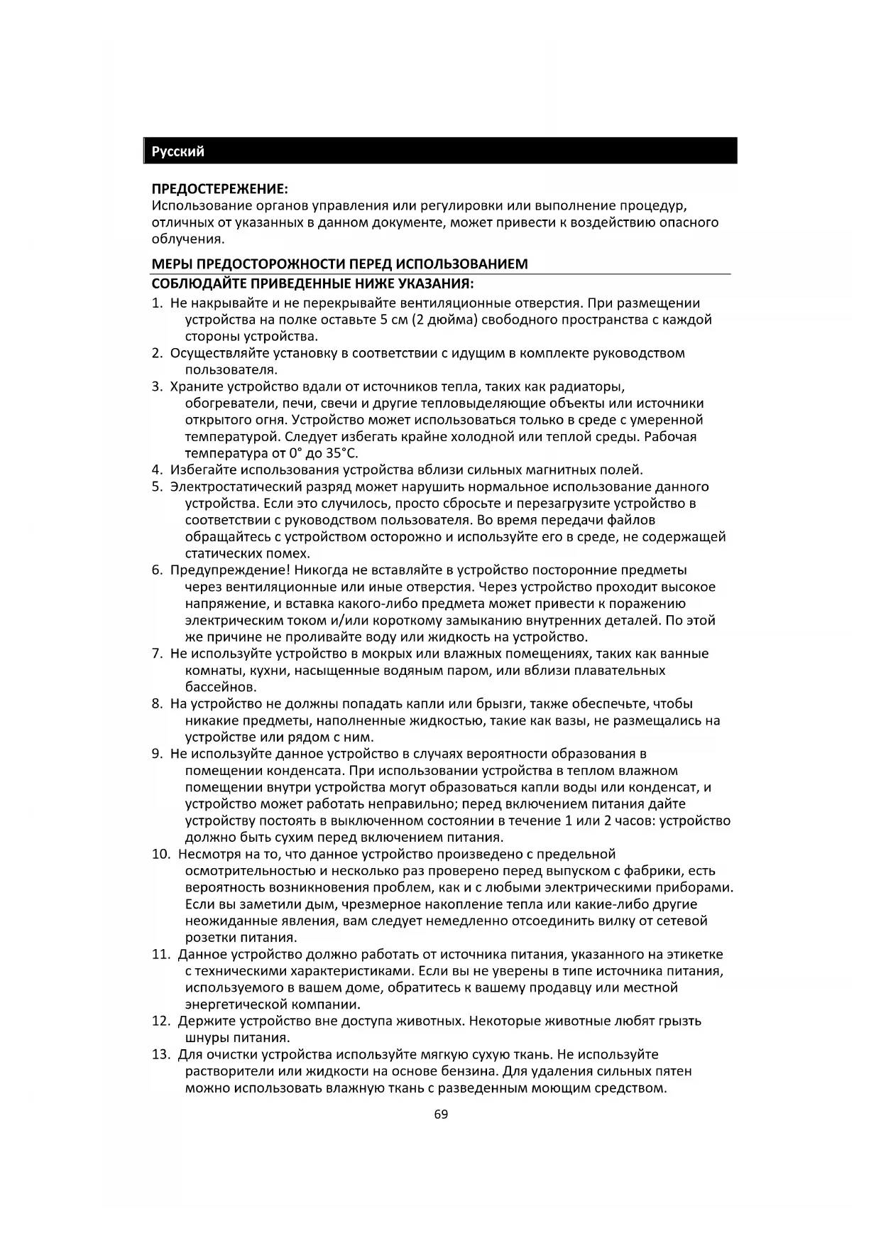 устройства. Если это случилось, просто сбросьте и перезагрузите устройство в соответствии с руководством пользователя. Во время передачи файлов обращайтесь с устройством осторожно и используйте его в среде, не содержащей статических помех.