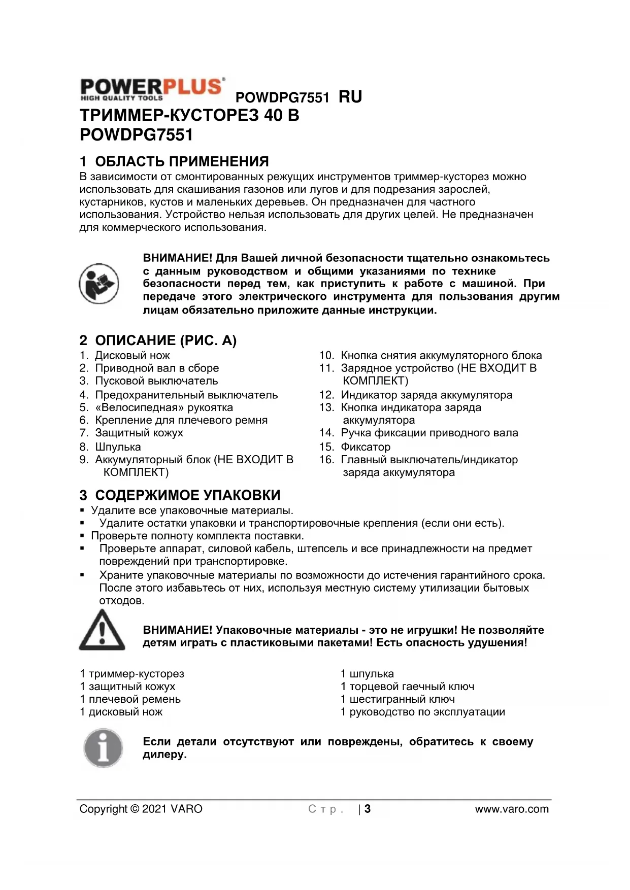 - 16 ДЕКЛАРАЦИЯ СООТВЕТСТВИЯ POWDPG7551 RU Copyright © 2021 VARO С т р . | 3 www.varo.com ТРИММЕР-КУСТОРЕЗ 40 В POWDPG7551 1 ОБЛАСТЬ ПРИМЕНЕНИЯ В зависимости от смонтированных режущих инструментов триммер-кусторез можно использовать для скашивания газонов или лугов и для подрезания зарослей, кустарников, кустов и маленьких деревьев. Он предназначен для частного использования. Устройство нельзя использовать для других целей. Не предназначен для коммерческого использования. ВНИМАНИЕ! Для Вашей личной безопасности тщательно ознакомьтесь с данным руководством и общими указаниями по технике безопасности перед тем, как приступить к работе с машиной. При передаче этого электрического инструмента для пользования другим лицам обязательно приложите данные инструкции. 2 ОПИСАНИЕ (РИС. A) p. 16
