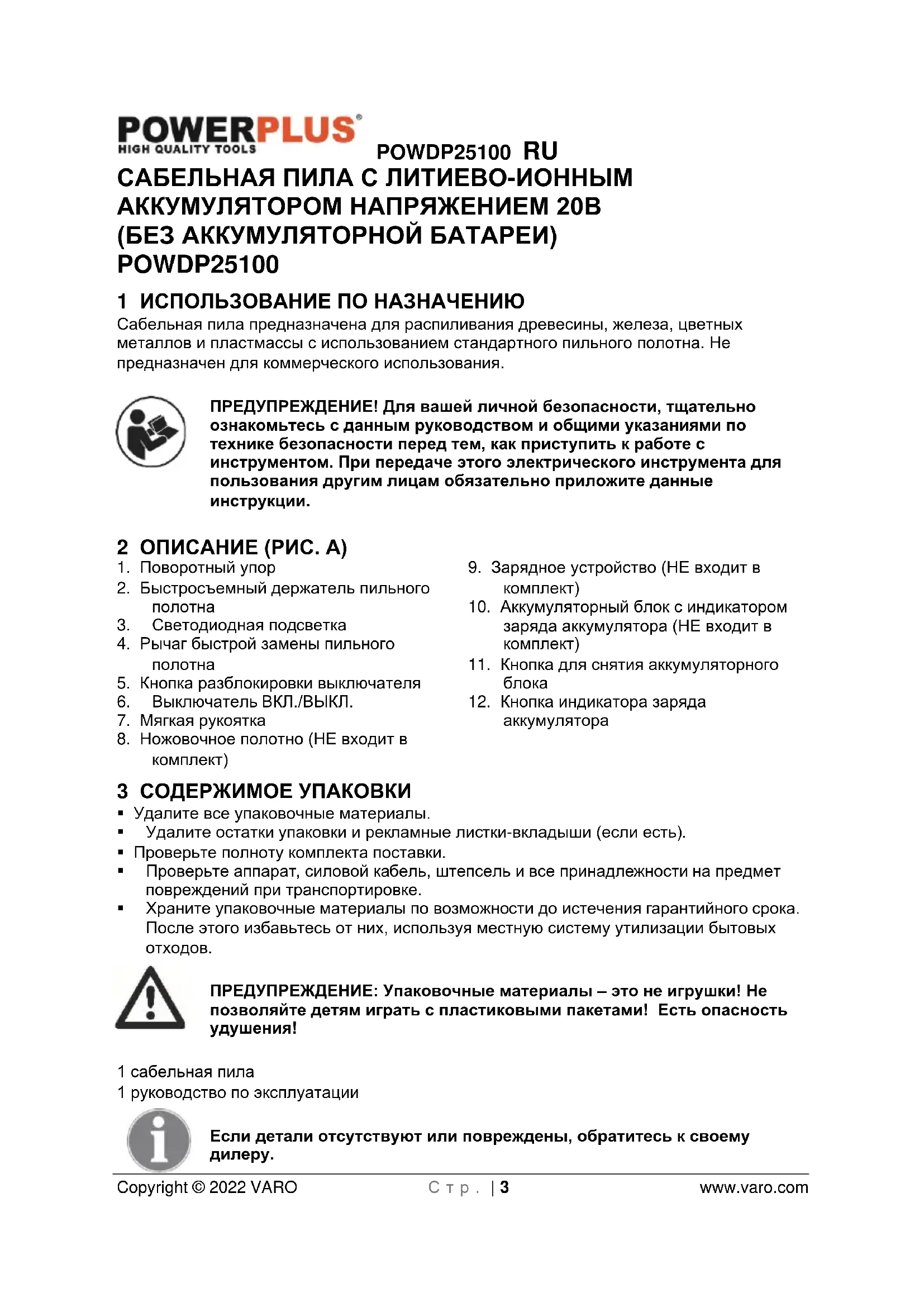 - Перед включением инструмента убедитесь, что пильное полотно не касается обрабатываемой заготовки.POWDP25100 RU Copyright © 2022 VARO С т р . | 7 www.varo.com
