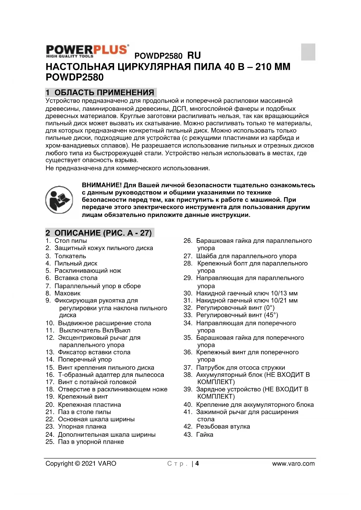- 18 ДЕКЛАРАЦИЯ О СООТВЕТСТВИИ POWDP2580 RU Copyright © 2021 VARO С т р . | 4 www.varo.com НАСТОЛЬНАЯ ЦИРКУЛЯРНАЯ ПИЛА 40 В – 210 MM POWDP2580 1 ОБЛАСТЬ ПРИМЕНЕНИЯ Устройство предназначено для продольной и поперечной распиловки массивной древесины, ламинированной древесины, ДСП, многослойной фанеры и подобных древесных материалов. Круглые заготовки распиливать нельзя, так как вращающийся пильный диск может вызвать их скатывание. Можно распиливать только те материалы, для которых предназначен конкретный пильный диск. Можно использовать только пильные диски, подходящие для устройства (с режущими пластинами из карбида и хром-ванадиевых сплавов). Не разрешается использование пильных и отрезных дисков любого типа из быстрорежущей стали. Устройство нельзя использовать в местах, где существует опасность взрыва. Не предназначена для коммерческого использования. ВНИМАНИЕ! Для Вашей личной безопасности тщательно ознакомьтесь с данным руководством и общими указаниями по технике безопасности перед тем, как приступить к работе с машиной. При передаче этого электрического инструмента для пользования другим лицам обязательно приложите данные инструкции. 2 ОПИСАНИЕ (РИС. A - 27) p. 23