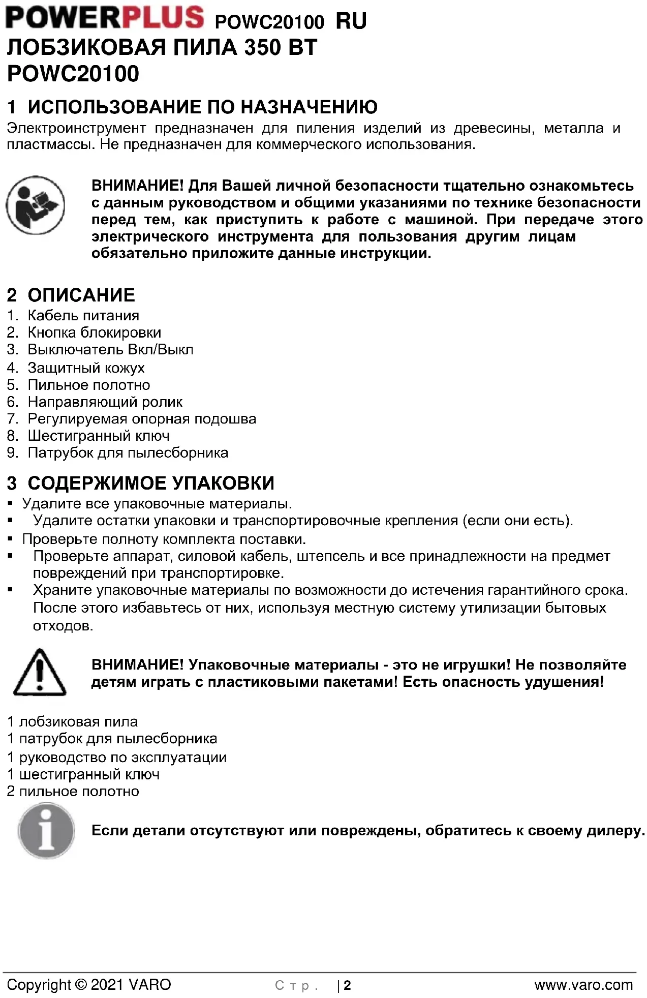 - 12 ДЕКЛАРАЦИЯ О СООТВЕТСТВИИ POWC20100 RU Copyright © 2021 VARO С т р . | 2 www.varo.com ЛОБЗИКОВАЯ ПИЛА 350 ВТ POWC20100 1 ИСПОЛЬЗОВАНИЕ ПО НАЗНАЧЕНИЮ Электроинструмент предназначен для пиления изделий из древесины, металла и пластмассы. Не предназначен для коммерческого использования. ВНИМАНИЕ! Для Вашей личной безопасности тщательно ознакомьтесь с данным руководством и общими указаниями по технике безопасности перед тем, как приступить к работе с машиной. При передаче этого электрического инструмента для пользования другим лицам обязательно приложите данные инструкции. 2 ОПИСАНИЕ p. 9