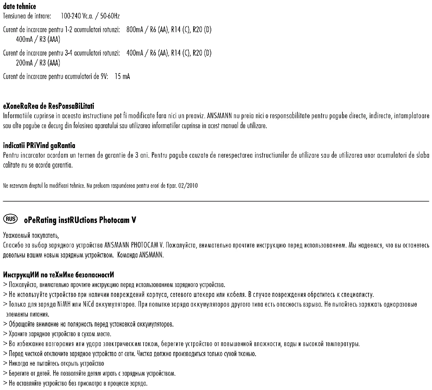 oPeRating instRUctions Photocam V Уважаемый покупатель, Спасибо за выбор зарядного устройства ANSMANN PHOTOCAM V. Пожалуйста, внимательно прочтите инструкцию перед использованием. Мы надеемся, что вы останетесь довольны вашим новым зарядным устройством. Команда ANSMANN. ИнструкцИИ по теХнИке безопасностИ > Пожалуйста, внимательно прочтите инструкцию перед использованием зарядного устройства. > Не используйте устройство при наличии повреждений корпуса, сетевого штекера или кабеля. В случае повреждения обратитесь к специалисту. > Только для заряда NiMH или NiCd аккумуляторов. При попытке заряда аккумуляторов другого типа есть опасность взрыва. Не пытайтесь заряжать одноразовые элементы питания. > Обращайте внимание на полярность перед установкой аккумуляторов. > Храните зарядное устройство в сухом месте. > Во избежание возгорания или удара электрическим током, берегите устройство от повышенной влажности, воды и высокой температуры. > Перед чисткой отключите зарядное устройство от сети. Чистка должна производиться только сухой тканью. > Никогда не пытайтесь открыть устройство > Берегите от детей. Не позволяйте детям играть с зарядным устройством. > Не оставляйте устройство без присмотра в процессе заряда.> Отключайте зарядное устройство от сети после использования. > Несоблюдение техники безопасности может привести к повреждению устройства и травме пользователя. > Мы рекомендуем вам использовать аккумуляторы ANSMANN. > Зарядное устройство для 1-4 NiMH / NiCd аккумуляторов размера AAA, AA, C и D или одного аккумулятора типа Крона. > Светодиоды, отображающие стадии процесса заряда. > Независимый заряд аккумулятора в каждой ячейке. > Защита от переполюсовки. > Возможность использования по всему миру (100-240В/50-60Гц) > Быстрая проверка емкости, 5 секунд после помещения аккумулятора в зарядное устройство. > Микропроцессорный контроль заряда, > Автоматическая регулировка тока в процессе заряда, > Многоступенчатая защита от перезаряда, > Поддержание заряда малым током, > Обнаружение неисправных и щелочных элементов питания. порЯДок работЫ Подсоедините зарядное устройство к электрической розетке (100-240В/50 – 60Гц). 1. Заряд цилиндрических аккумуляторов. Может заряжаться от одного до четырех NiMH или NiCd аккумулятора размеров AAA, AA, C и D. Для того, чтобы вставить цилиндрические аккумуляторы, потяните назад контактный мост и положите аккумулятор на дно ячейки. Всегда следите за полярностью аккумуляторов согласно рисунку на зарядном устройстве. Сразу после того, как аккумулятор был вставлен в зарядное устройство, оно измеряет его емкость и сообщает результат примерно через 5 секунд с помощью светодиода около данной ячейки сразу за специальным разъемом для заряда (см. Быстрое измерение емкости цилиндрических аккумуляторов). Затем процесс заряда начинается автоматически. Состояние заряда аккумуляторов до начала процесса заряда не имеет значения. Статус заряда каждого аккумулятора показывается соответствующим светодиодом напротив каждой ячейки. (см. Отображение статуса заряда цилиндрических аккумуляторов). Аккумуляторы не обязательно должны быть вставлены одновременно, так как процесс заряда каждого аккумулятора проходит независимо. Возможно увеличение температуры заряжаемых аккумуляторов. По окончанию процесса заряда устройство автоматически переходит в режим поддержания з