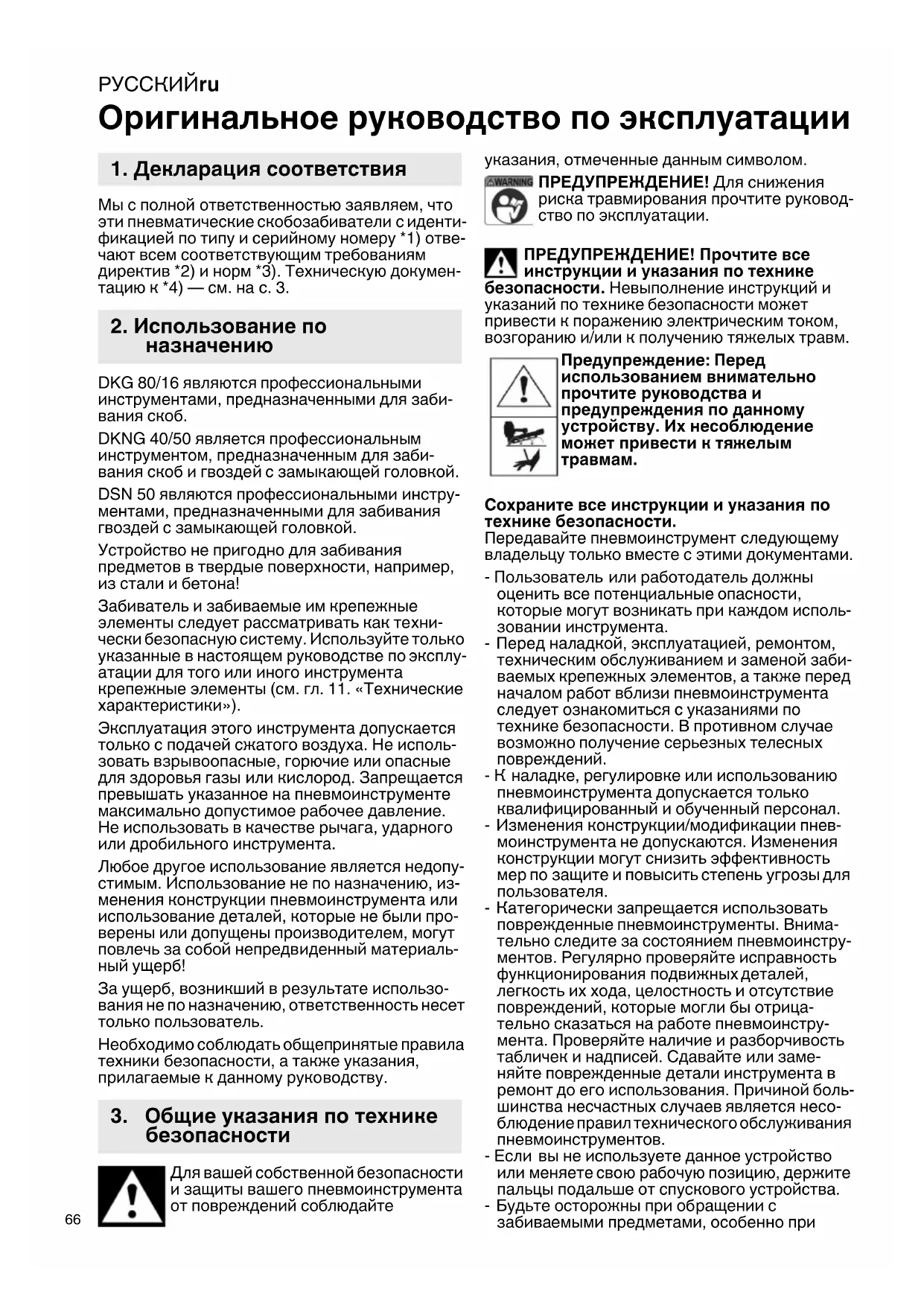 Оригинальное руководство по эксплуатации Мы с полной ответственностью заявляем, что эти пневматические скобозабиватели с иденти- фикацией по типу и серийному номеру *1) отве- чают всем соответствующим требованиям директив *2) и норм *3). Техническую докумен- тацию к *4) — см. на с. 3. DKG 80/16 являются профессиональными инструментами, предназначенными для заби- вания скоб. DKNG 40/50 является профессиональным инструментом, предназначенным для заби- вания скоб и гвоздей с замыкающей головкой. DSN 50 являются профессиональными инстру- ментами, предназначенными для забивания гвоздей с замыкающей головкой. Устройство не пригодно для забивания предметов в твердые поверхности, например, из стали и бетона! Забиватель и забиваемые им крепежные элементы следует рассматривать как техни- чески безопасную систему. Используйте только указанные в настоящем руководстве по эксплу-