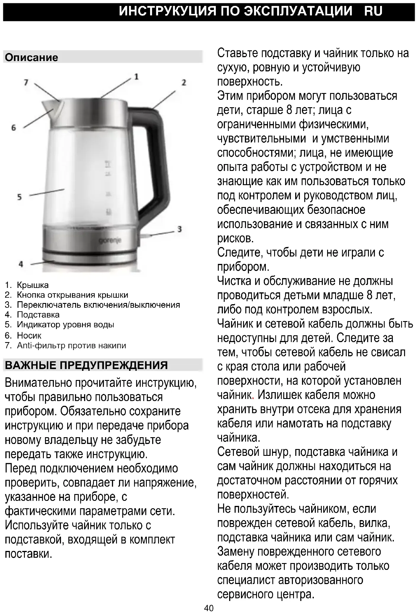 ВАЖНЫЕ ПРЕДУПРЕЖДЕНИЯ Внимательно прочитайте инструкцию, чтобы правильно пользоваться прибором. Обязательно сохраните инструкцию и при передаче прибора новому владельцу не забудьте передать также инструкцию. Перед подключением необходимо проверить, совпадает ли напряжение, указанное на приборе, с фактическими параметрами сети. Используйте чайник только с подставкой, входящей в комплект