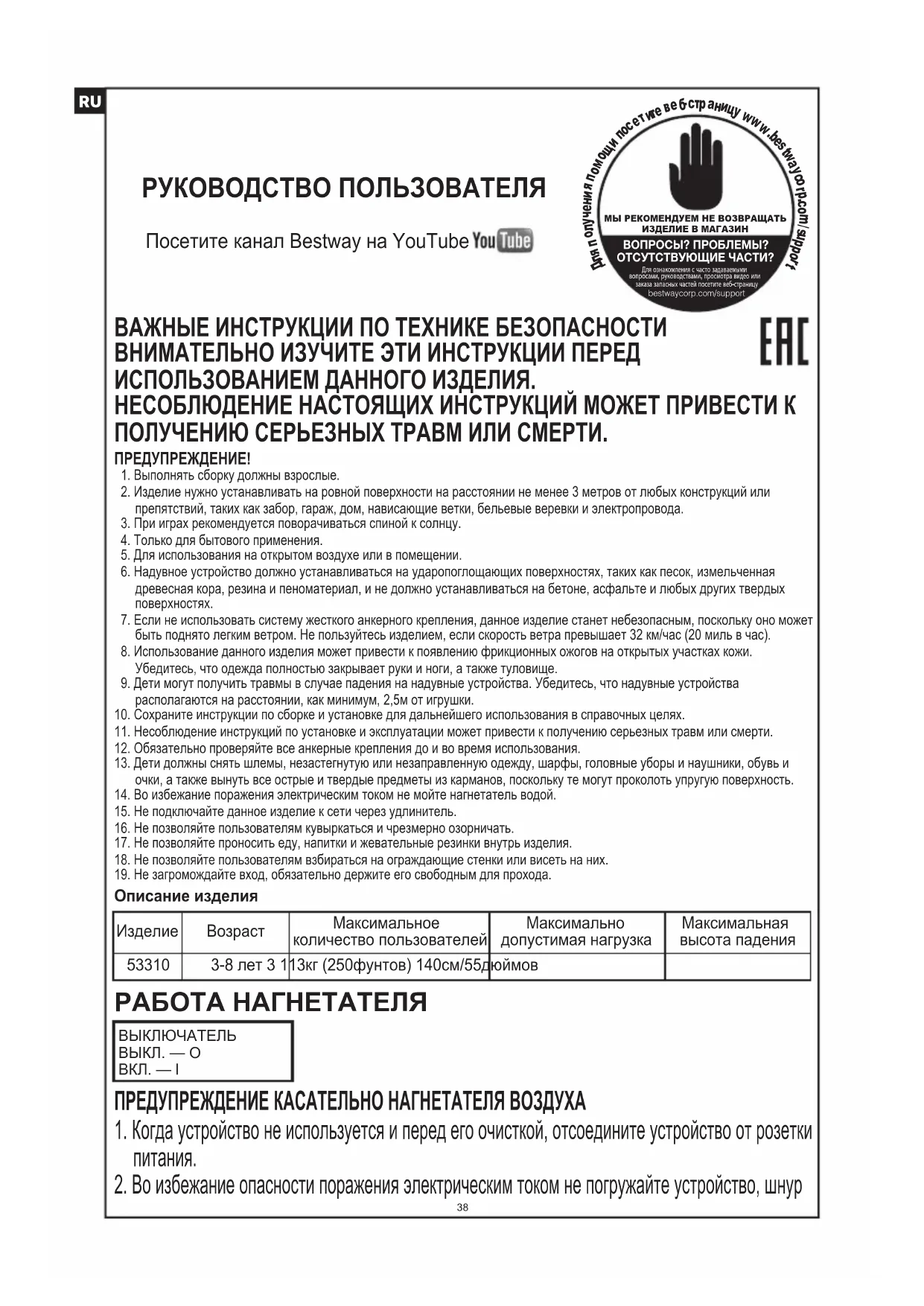 РУКОВОДСТВО ПОЛЬЗОВАТЕЛЯ Up In & Over 53310 BESTWAY