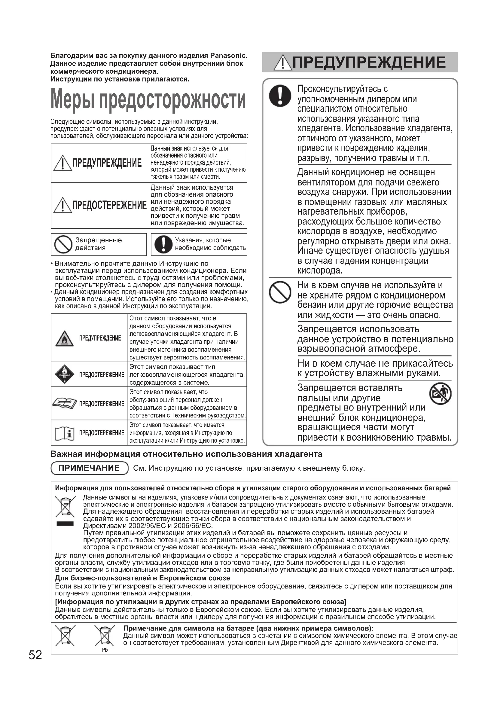 Ни в коем случае не используйте и не храните рядом с кондиционером бензин или другие горючие вещества или жидкости — это очень опасно. Запрещается использовать данное устройство в потенциально взрывоопасной атмосфере. Ни в коем случае не прикасайтесь к устройству влажными руками. Запрещается вставлять пальцы или другие предметы во внутренний или внешний блок кондиционера, вращающиеся части могут привести к возникновению травмы. ПРЕДУПРЕЖДЕНИЕ ПРЕДУПРЕЖДЕНИЕЭтот символ показывает, что в данном оборудовании используется легковоспламеняющийся хладагент. В случае утечки хладагента при наличии внешнего источника воспламенения существует вероятность воспламенения.ПРЕДОСТЕРЕЖЕНИЕЭтот символ показывает тип легковоспламеняющегося хладагента, содержащегося в системе.ПРЕДОСТЕРЕЖЕНИЕЭтот символ показывает, что обслуживающий персонал должен обращаться с данным оборудованием в соответствии с Техническим руководством.ПРЕДОСТЕРЕЖЕНИЕЭтот символ показывает, что имеется информация, входящая в Инструкцию по эксплуатации и/или Инструкцию по установке.Важная информация относительно использования хладагентаПРИМЕЧАНИЕ См. Инструкцию по установке, прилагаемую к внешнему блоку.Информация для пользователей относительно сбора и утилизации старого оборудования и использованных батарей анные символы на изделиях, упаковке и/или сопроводительных документах означают, что использованные электрические и электронные изделия и батареи запрещено утилизировать вместе с обычными бытовыми отходами.Для надлежащего обращения, восстановления и переработки старых изделий и использованных батарей сдавайте их в соответствующие точки сбора в соответствии с национальным законодательством и Директивами 2002/96/EC и 2006/66/EC.Путем правильной утилизации этих изделий и батарей вы поможете сохранить ценные ресурсы и предотвратить любое потенциальное отрицательное воздействие на здоровье человека и окружающую среду, которое в противном случае может возникнуть из-за ненадлежащего обращения с отходами.Для получения дополнительной информации о сборе и переработке старых изделий и батарей обращайтесь в местные органы власти, службу утилизации отходов или в торговую точку, где были приобретены данные изделия.В соответствии с национальным законодательством за неправильную утилизацию данных отходов может налагаться штраф.Для бизнес-пользователей в Европейском союзе Если вы хотите утилизировать электрическое и электронное оборудование, свяжитесь с дилером или поставщиком для получения дополнительной информации.[Информация по утилизации в других странах за пределами Европейского союза] Данные символы действительны только в Европейском союзе. Если вы хотите утилизировать данные изделия, обратитесь в местные органы власти или к дилеру для получения информации о правильном способе утилизации. Примечание для символа на батарее (два нижних примера символов):Данный символ может использоваться в сочетании с символом химического элемента. В этом случае он соответствует требованиям, установленным Директивой для данного химического элемента. 00_330260_all.indb 52 2020/11/23 13:35:2953