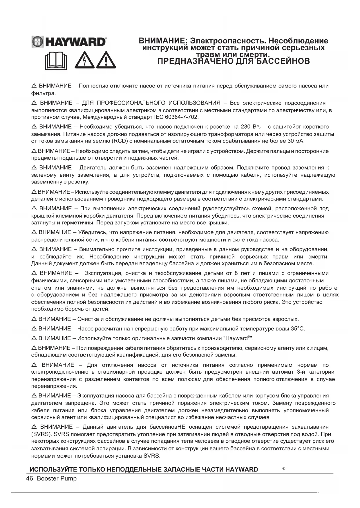 - ВНИМАНИЕ – Данный двигатель для бассейновНЕ оснащен системой предотвращения захватывания (SVRS). SVRS помогает предотвратить утопление при затягивании людей в отводные отверстия под водой. При некоторых конструкциях бассейнов в случае попадания тела человека в отводное отверстие существует риск его захватывания системой аспирации. В зависимости от конструкции вашего бассейна в соответствии с местными нормами может потребоваться установка SVRS. ВНИМАНИЕ: Электроопасность. Несоблюдение инструкций может стать причиной серьезных травм или смерти. ПРЕДНАЗНАЧЕНО ДЛЯ БАССЕЙНОВ c•ИСПОЛЬЗУЙТЕ ТОЛЬКО НЕПОДДЕЛЬНЫЕ ЗАПАСНЫЕ ЧАСТИ HAYWARD